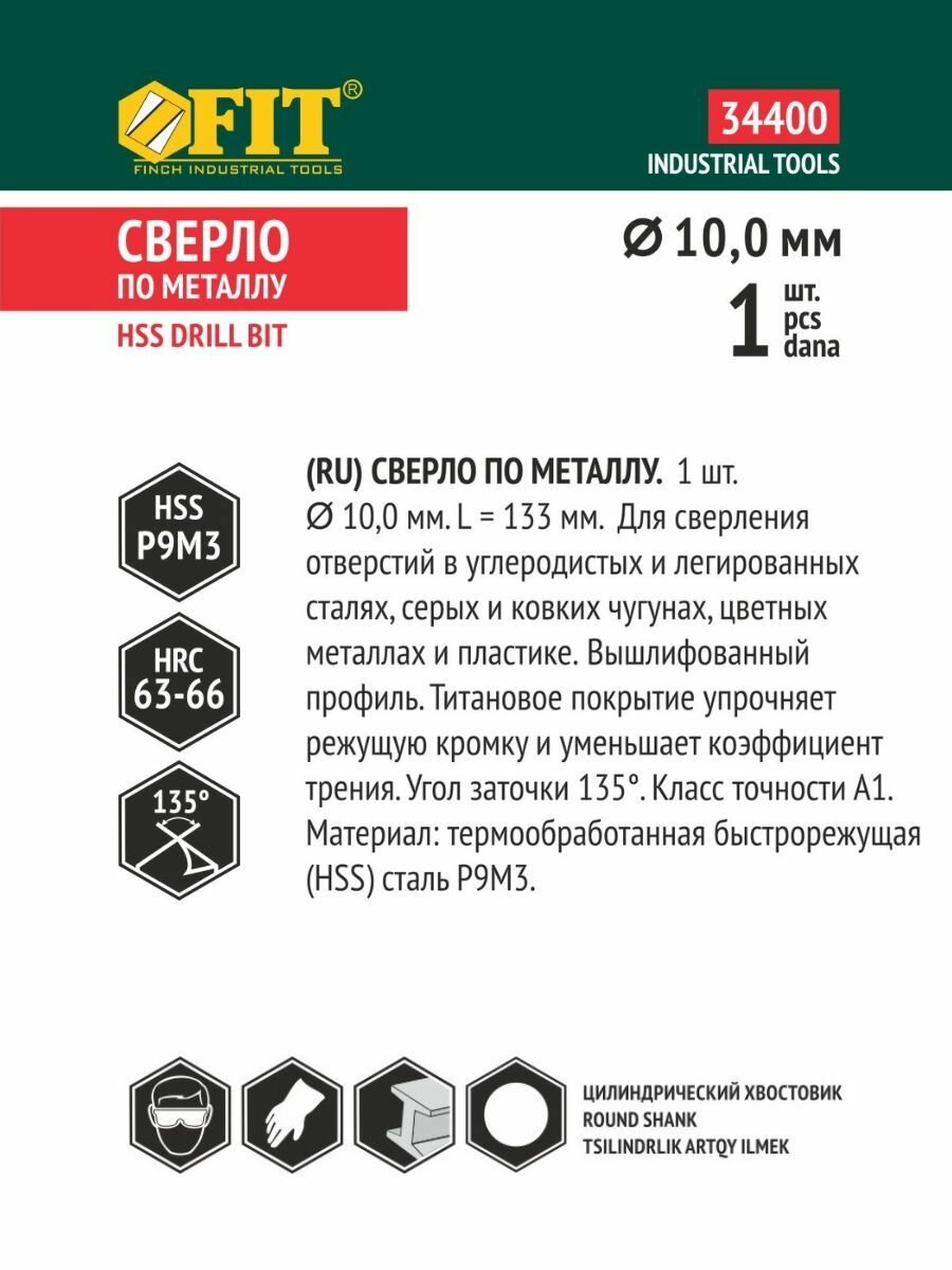 FIT Сверла по металлу 1 х 34 мм набор 10 шт. HSS Р9М3 титановое покрытие