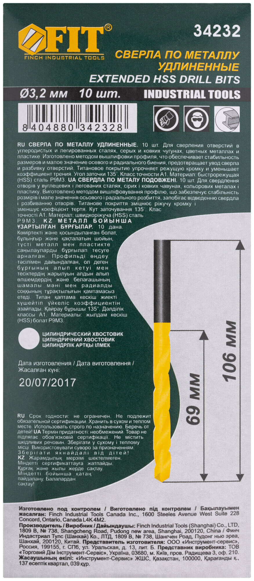 Сверла HSS по металлу, удлиненные, титановое покрытие 4,2х119 мм (10 шт.), FIT 34242 (1 шт.)