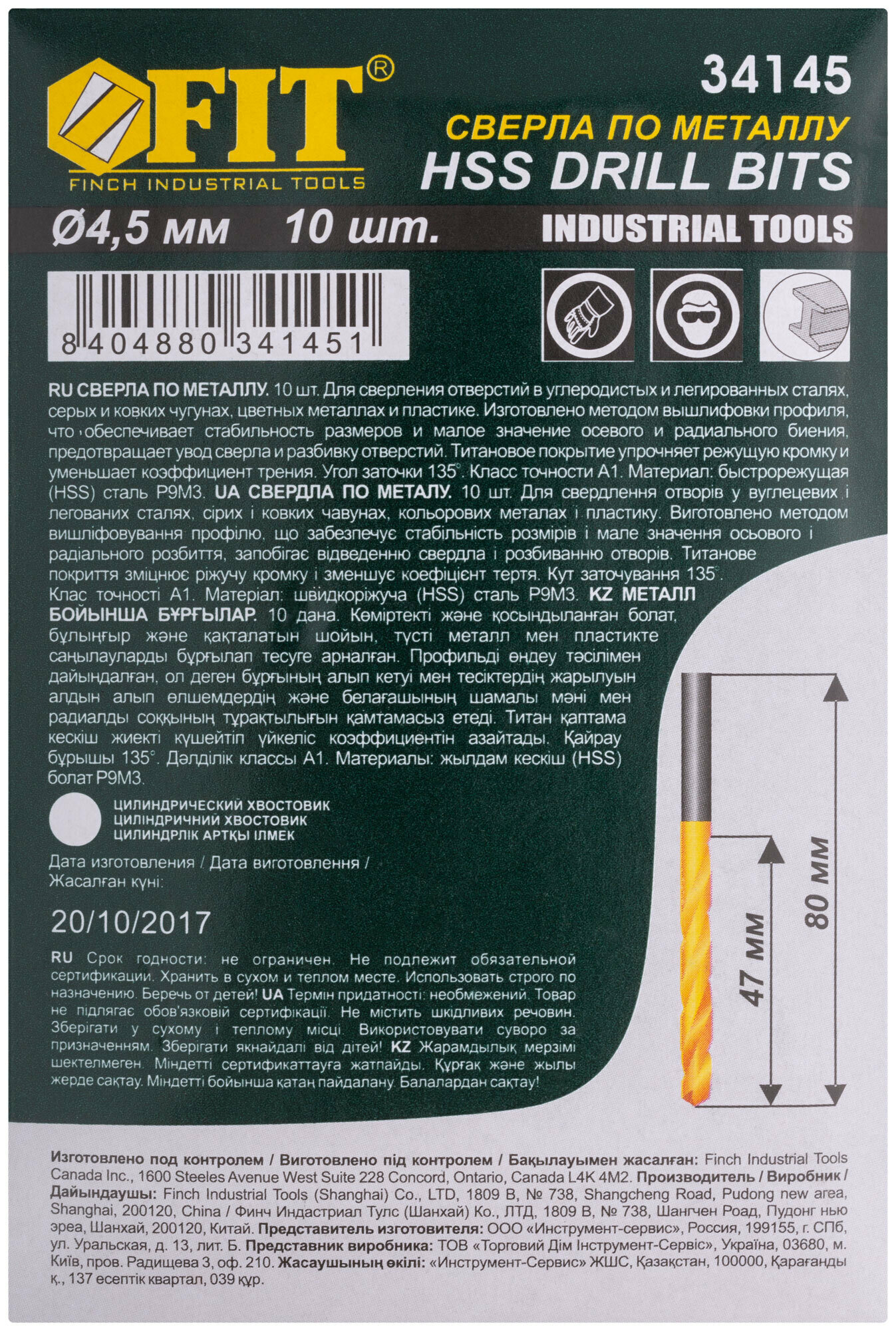Сверла HSS по металлу, титановое покрытие 4,5 мм (10 шт.) FIT 34145