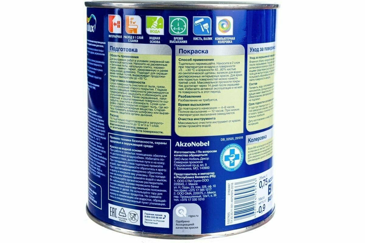 Краска Dulux. Полуглянцевая. База BW 0,75 л. Для напольных покрытий. Водно-дисперсионная. Полы и лестницы.