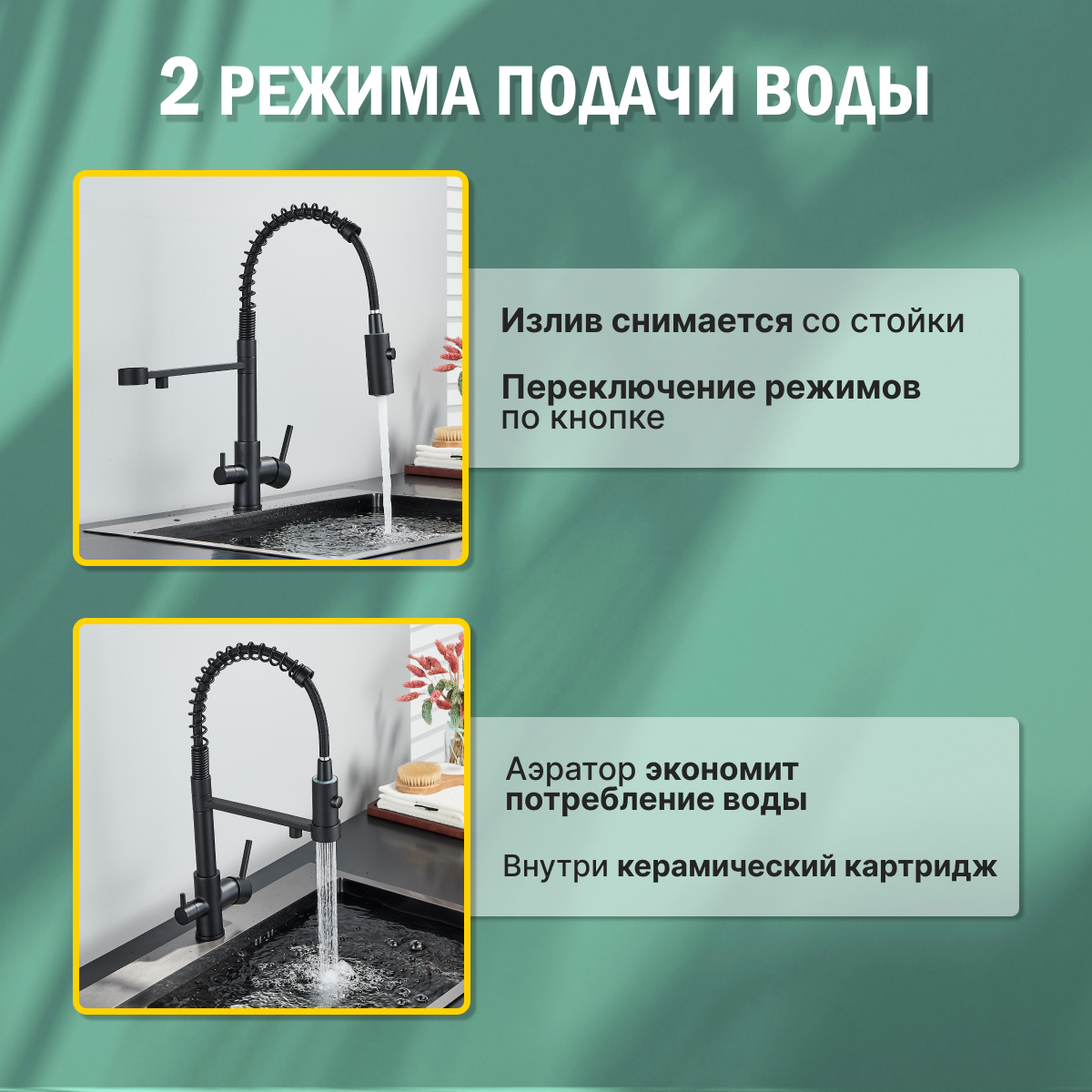 Смеситель кран для кухни с фильтром для питьевой воды, с гибким изливом, кухонный черный