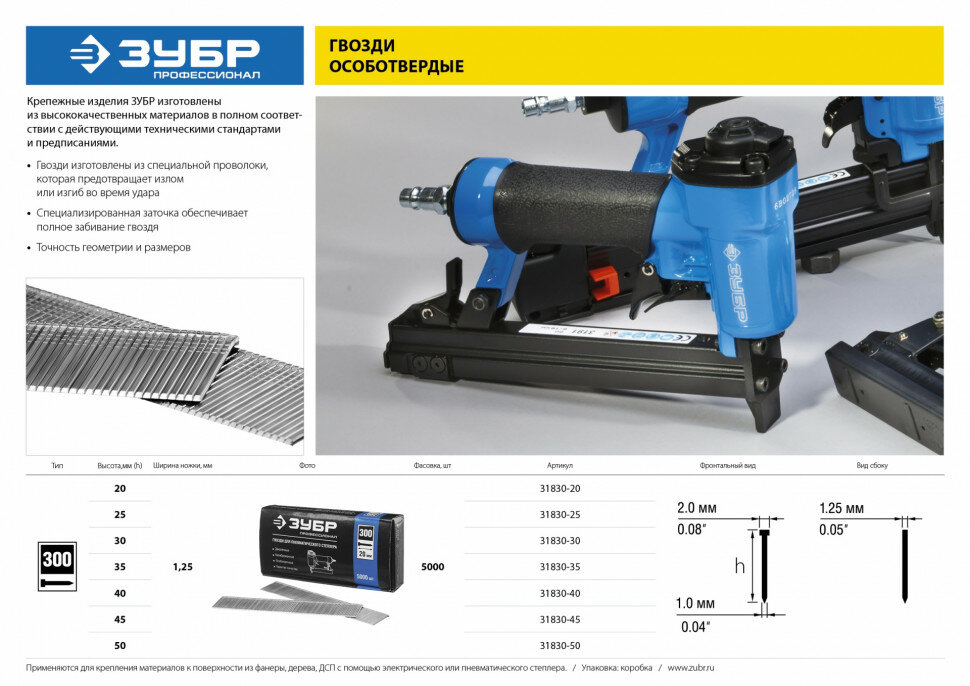 Особотвердые гвозди для нейлера ЗУБР Профессионал тип 300, 50 мм, 5000 шт. 31830-50