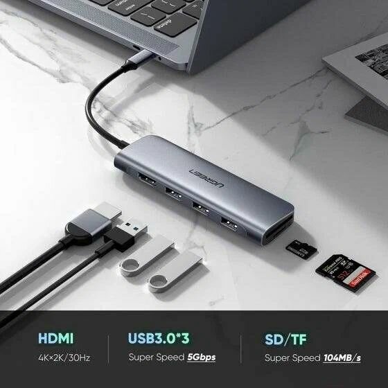 Купить Док-станция UGREEN CM195 (15214) USB-C To HDMI+2*USB 3.0 A+ USB-C+SD/TF+PD Converter. Цвет: серый космос.