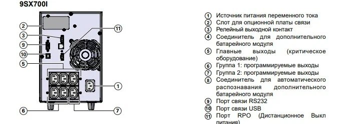 | Дополнительная информация | 1 мини-терминал для дистанционного выключения питания + 1 мини-клеммный блок для выходного реле; коэффициент выходной мощности 0.9; журнал событий и ошибок; встроенный счетчик электроэнергии; автозапуск; принудительная перезагрузка; режим сохранения энергии; режим сна; класс защиты IP20; топология двойного преобразования; с сетевой картой работает в виртуальных средах; ЖК-дисплей с русифицированным меню; возможность управления сегментами нагрузки и удаленной перезагрузки устройств; RPO |