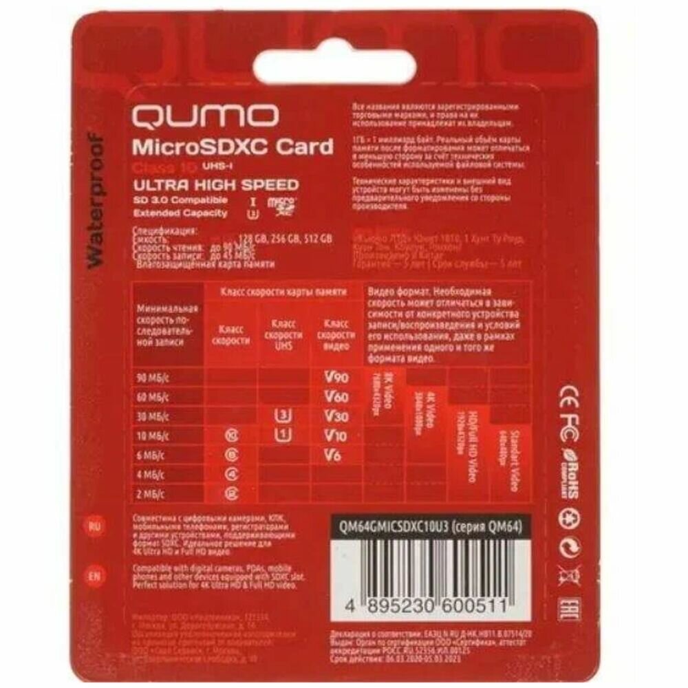 Карта памяти microSDXC Qumo QM64GMICSDXC10U3 64 Гб класс 10 UHS-I (U3) - 90*45 МБ/с UHD Video 4K - с адаптером SD