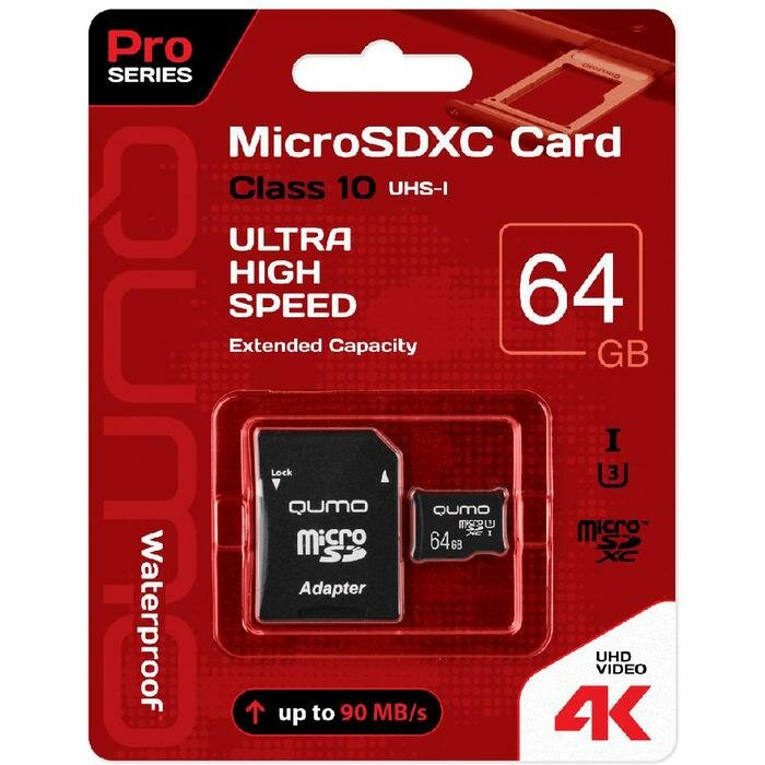Карта памяти microSDXC Qumo QM64GMICSDXC10U3 64 Гб класс 10 UHS-I (U3) - 90*45 МБ/с UHD Video 4K - с адаптером SD