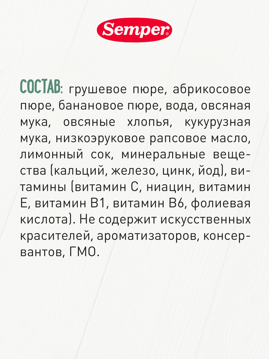 | Состав | грушевое пюре / абрикосовое пюре / банановое пюре / вода / овсяная мука / овсяные хлопья / Кукурузная мука / низкоэруковое рапсовое масло / лимонный сок / минеральные вещества (кальций / железо / цинк / йод) / ВИТАМИНЫ (витамин С / ниацин / виамин Е / витамин В1 / витамин В6 / фолиевая кислота) |