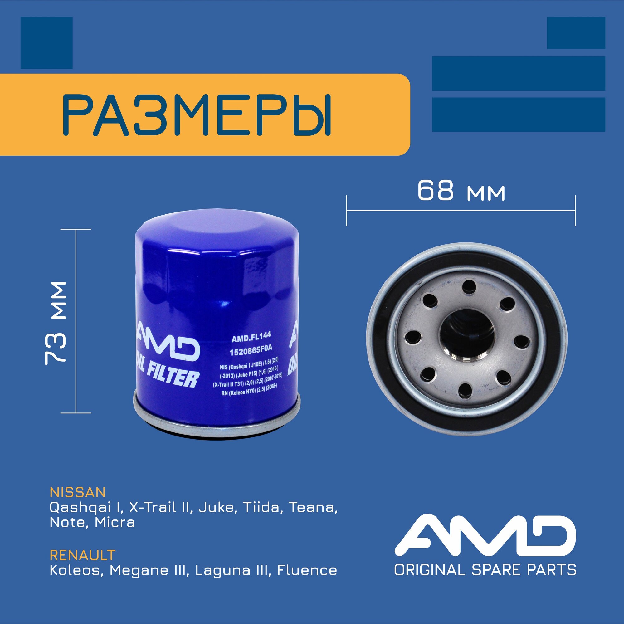 Фильтр масляный 1520865F0A AMD.FL144 для NISSAN Qashqai I J10E 1,6 2,0 -2013 Juke F15 1,6 2010- X-Trail II T31 2,0 2,5 2007-2015 RENAULT Koleos HY0 2,5 2008-
