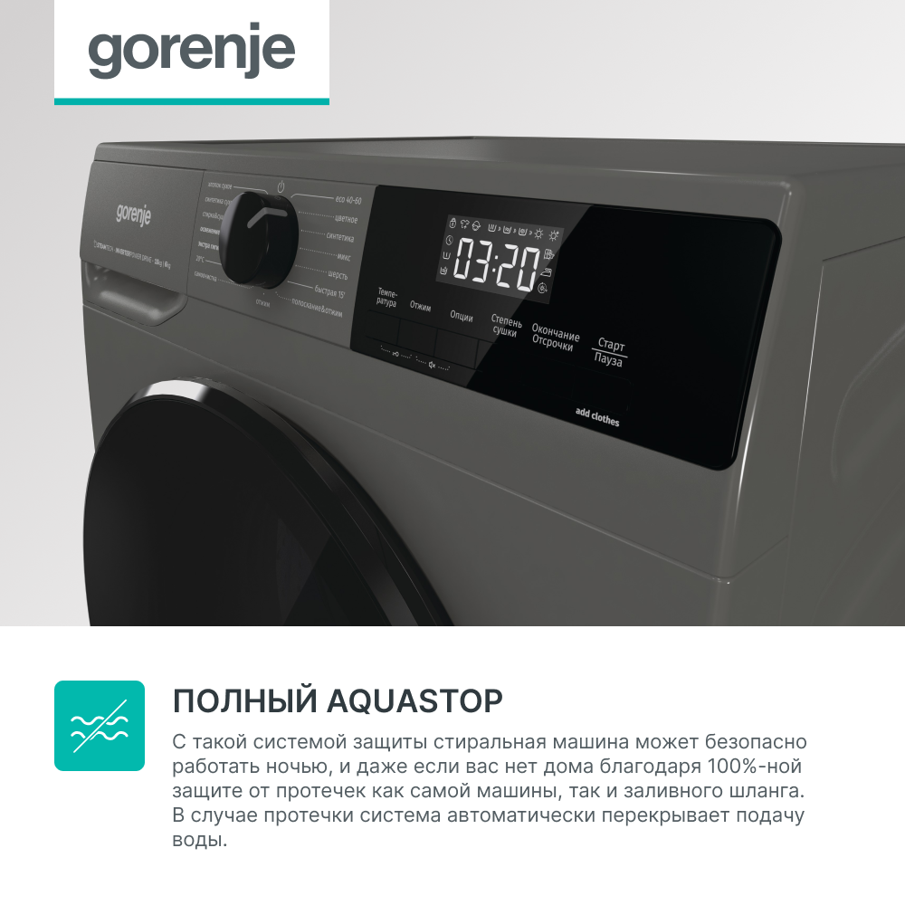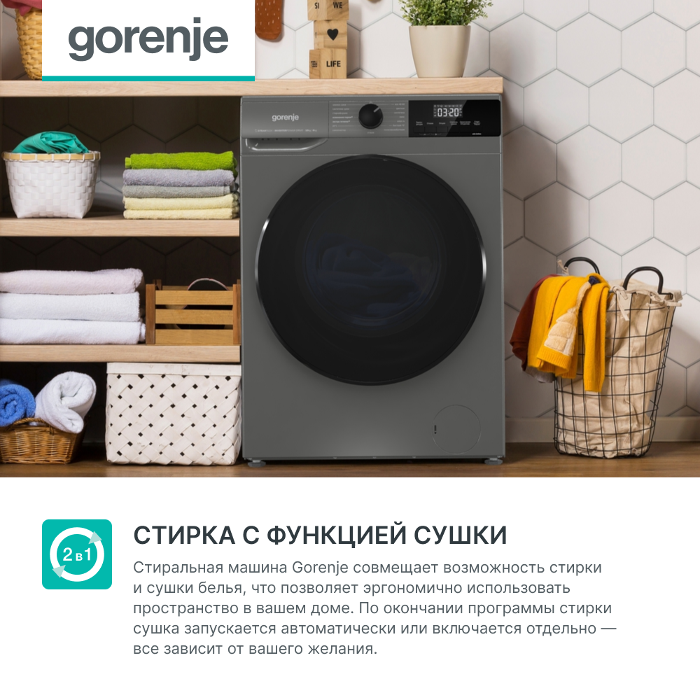 СохранитьСтирально-сушильная машина Gorenje W2D2A164ADSS/C, класс энергопотребления A, 10 кг/6 кг, 1400 об./мин., обработка паром, инверторный мотор, полный AquaStop, серый/черный интересное: