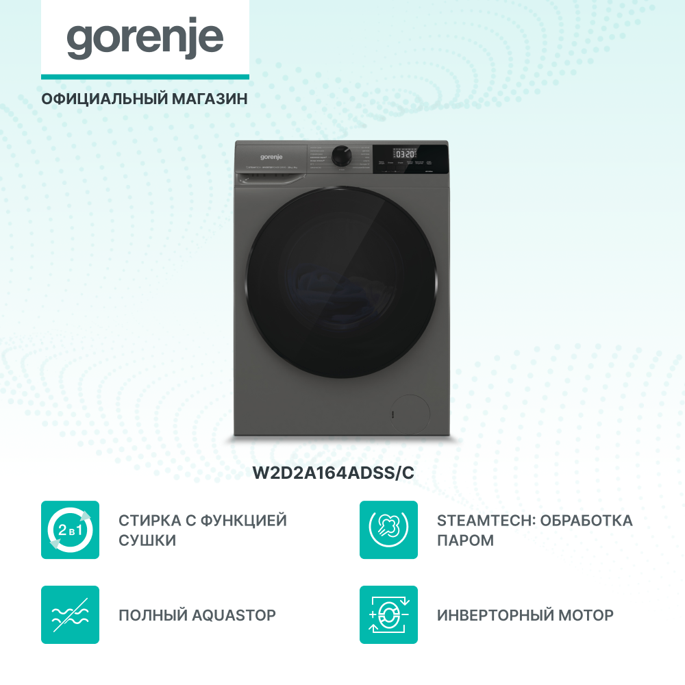 Купить Стирально-сушильная машина Gorenje W2D2A164ADSS/C, класс энергопотребления A, 10 кг/6 кг, 1400 об./мин., обработка паром, инверторный мотор, полный AquaStop, серый/черный