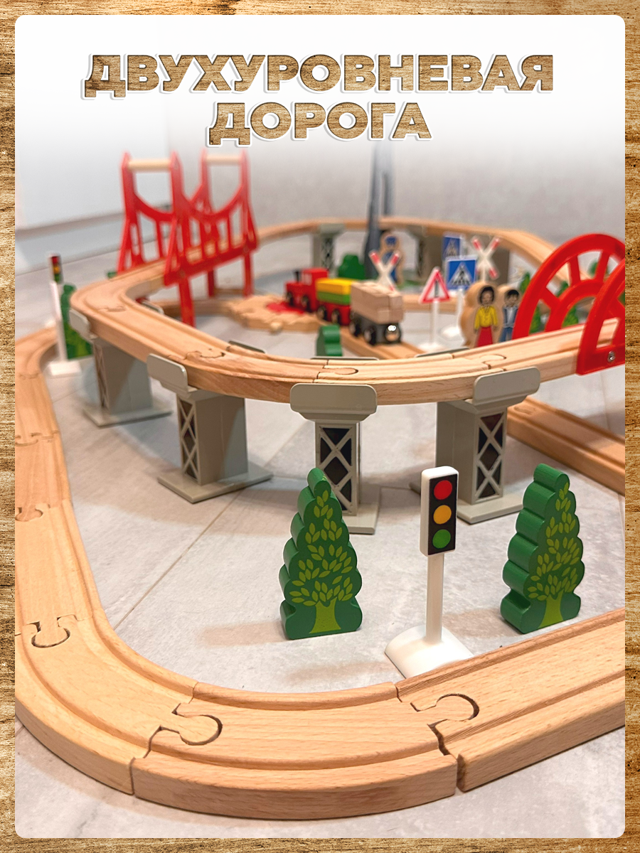 Деревянная железная дорога для детей 69 деталей и поезда — Развивающая игрушка для сюжетно-ролевых игр
