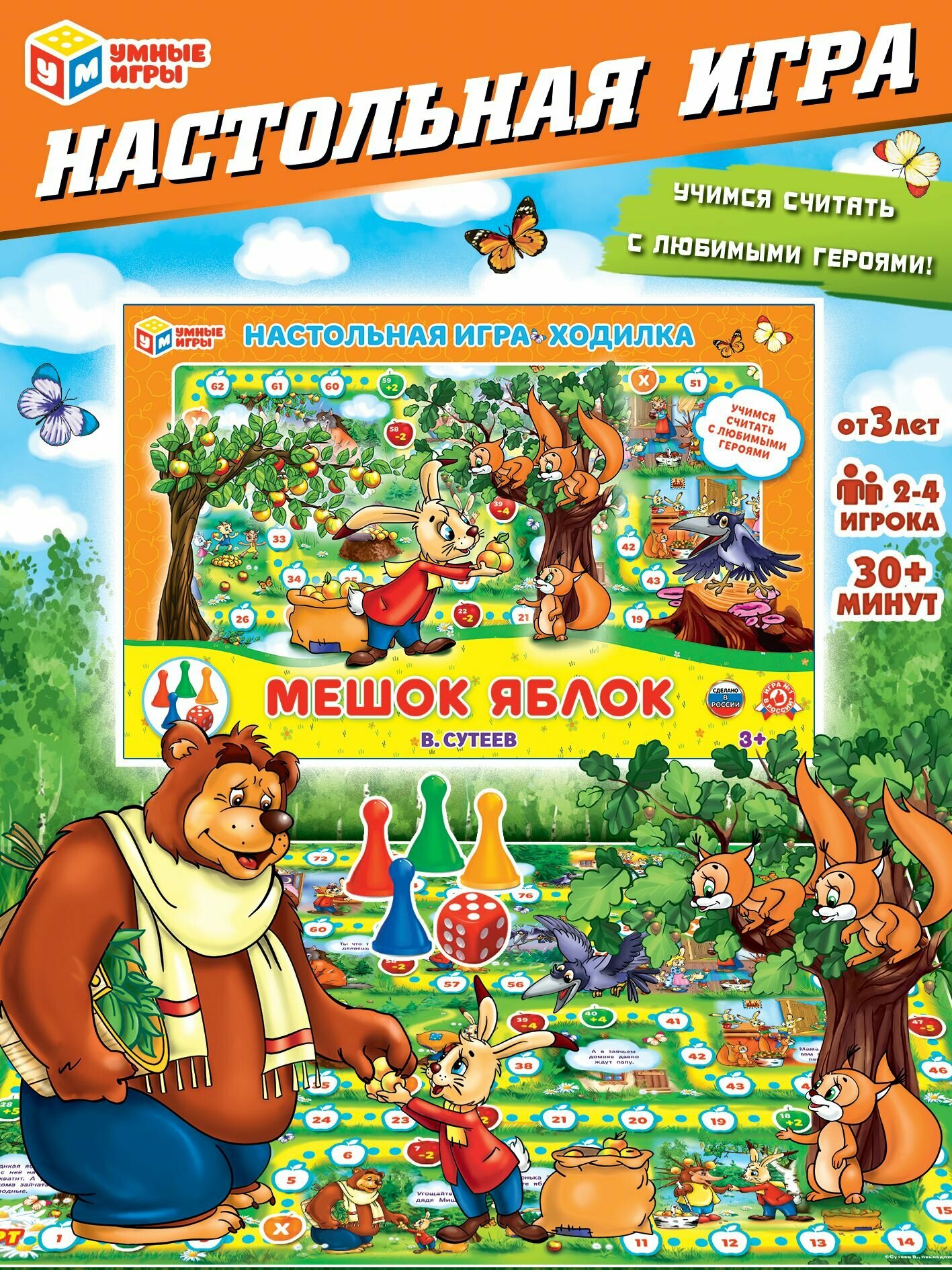 Настольная игра ходилка для детей Мешок яблок В. Сутеев, Умные игры, 2-4 игрока, для детей старше 3-х лет интересное: