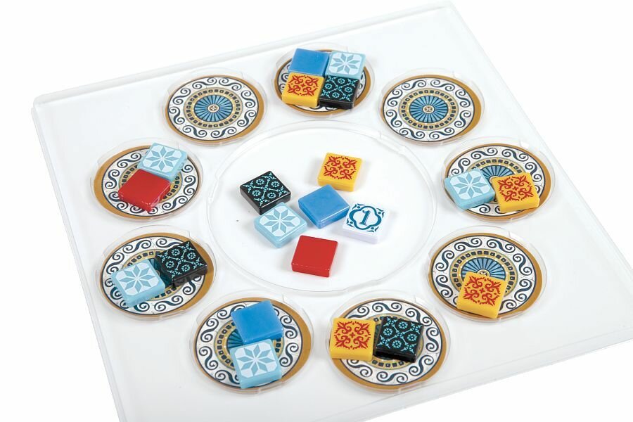 | Комплектация | 9 дисков складов, 4 планшета игроков, 4 фишки победных очков, 100 пластиковых плиток, мешочек для плиток, 1 жетон первого игрока, правила |