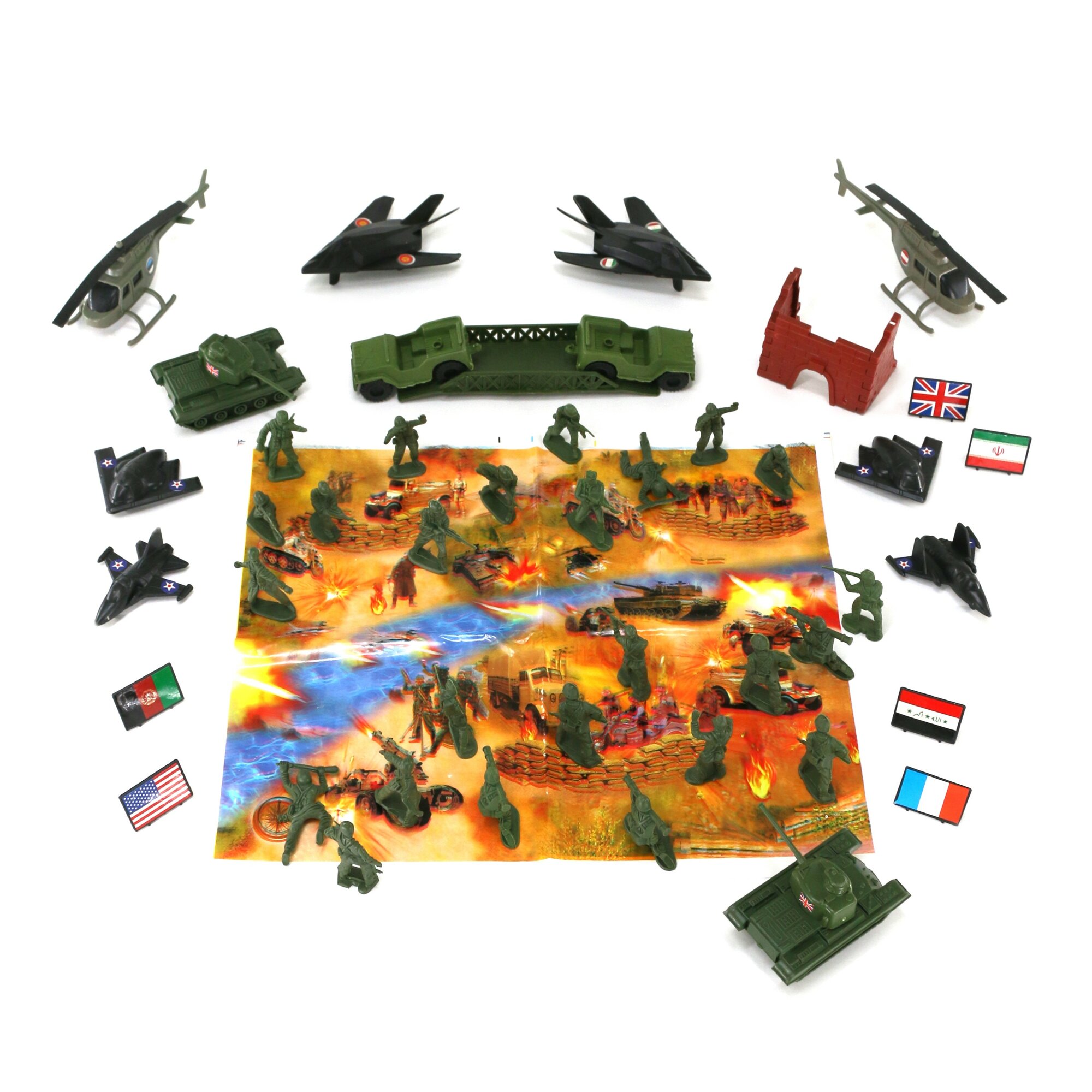 | Комплектация | фигурки военных, вертолеты-2 штуки, самолеты-2 штуки, военные машины-2 штуки, танка-2 штуки, истребители-2 штуки, карта |
