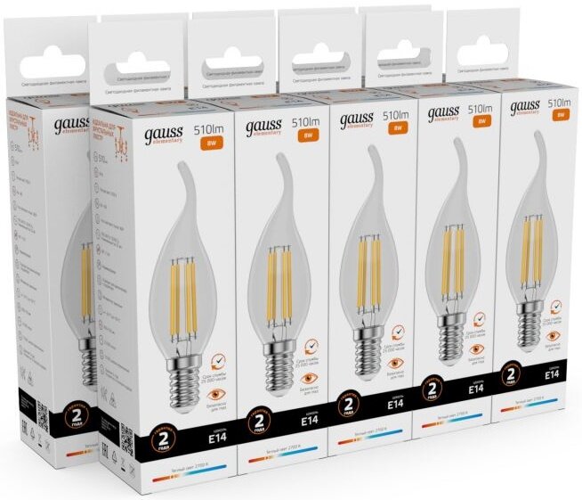Лампочка светодиодная E14 Свеча 8W теплый свет 2700К упаковка 10 шт. Gauss Elementary Filament