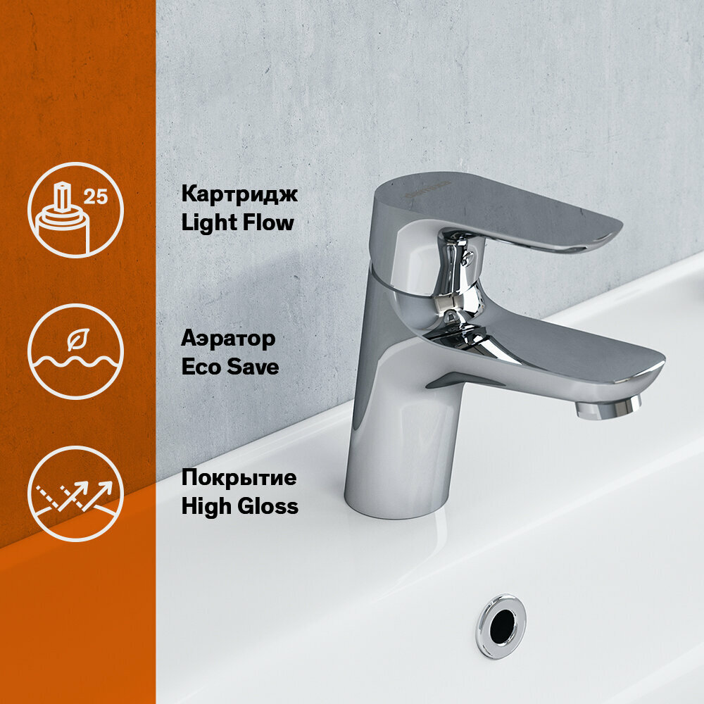 Смеситель для раковины Damixa Jupiter 770210001 керамический картридж Light Flow, покрытие High Gloss, аэратор EcoSave, латунь