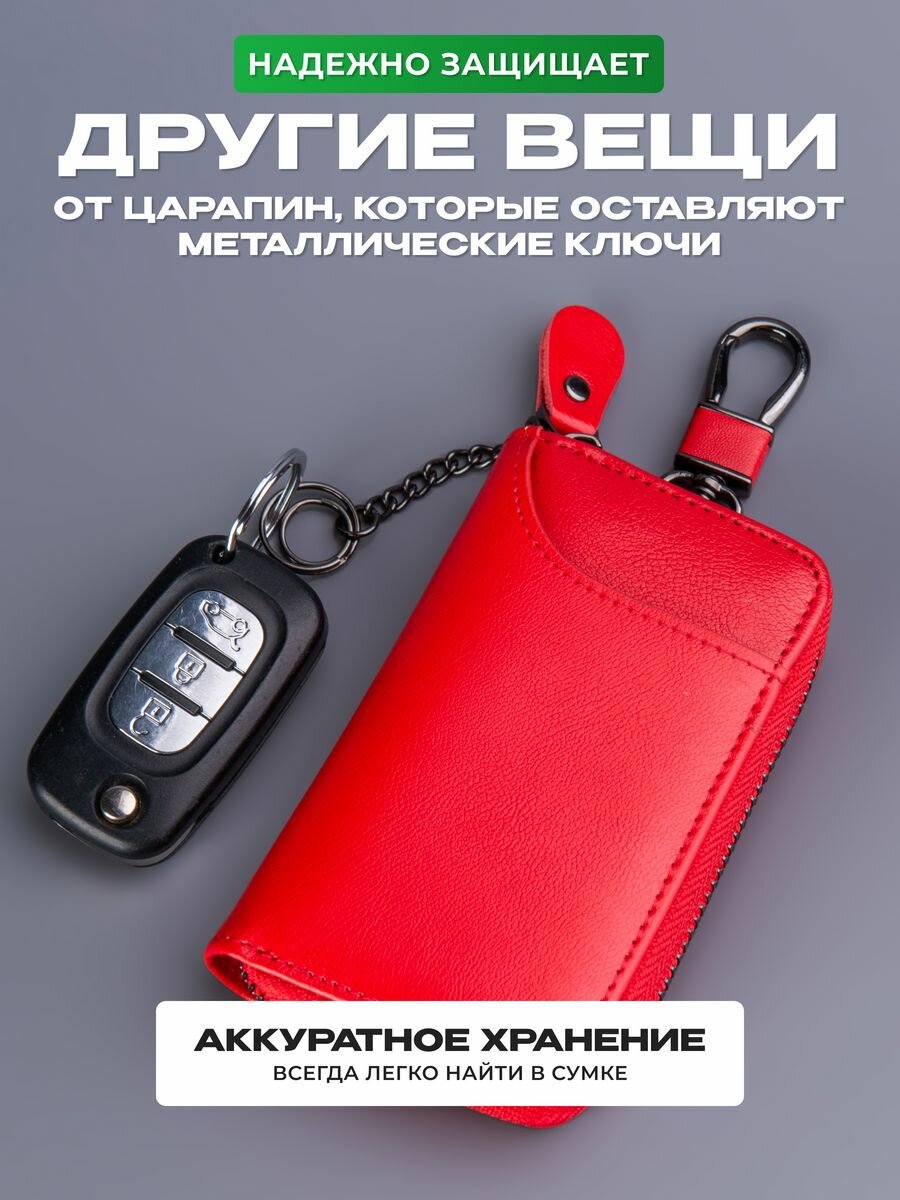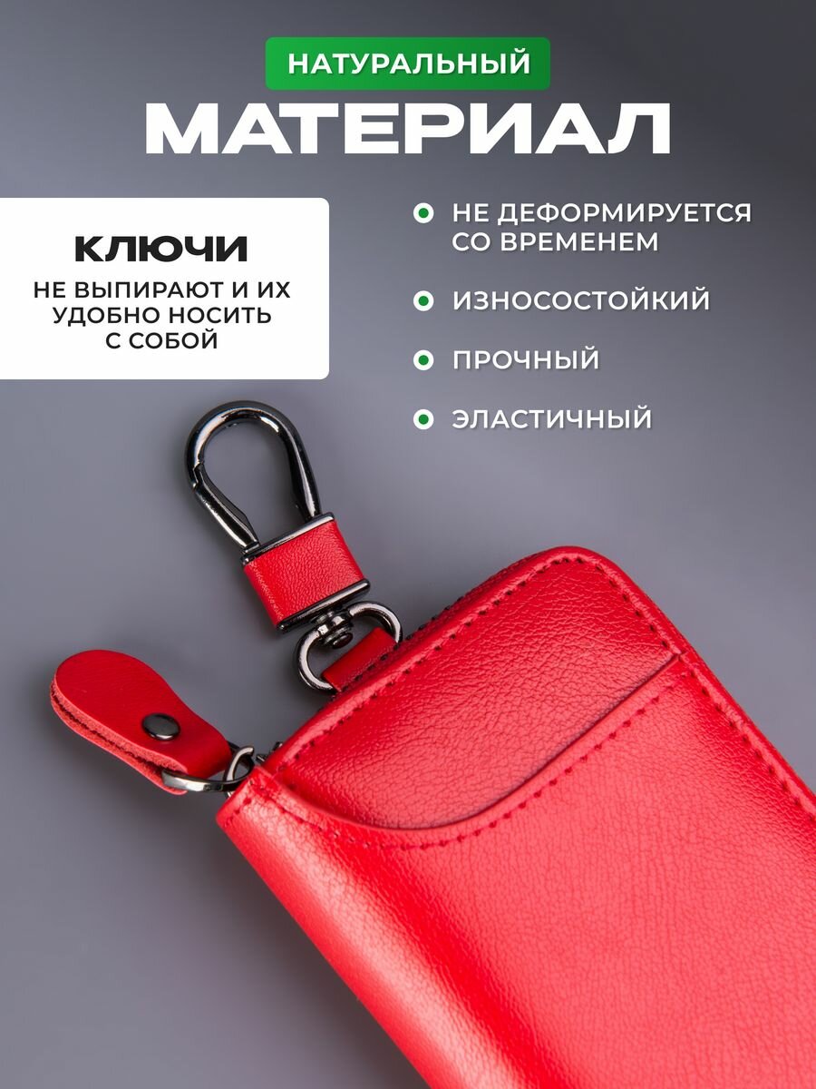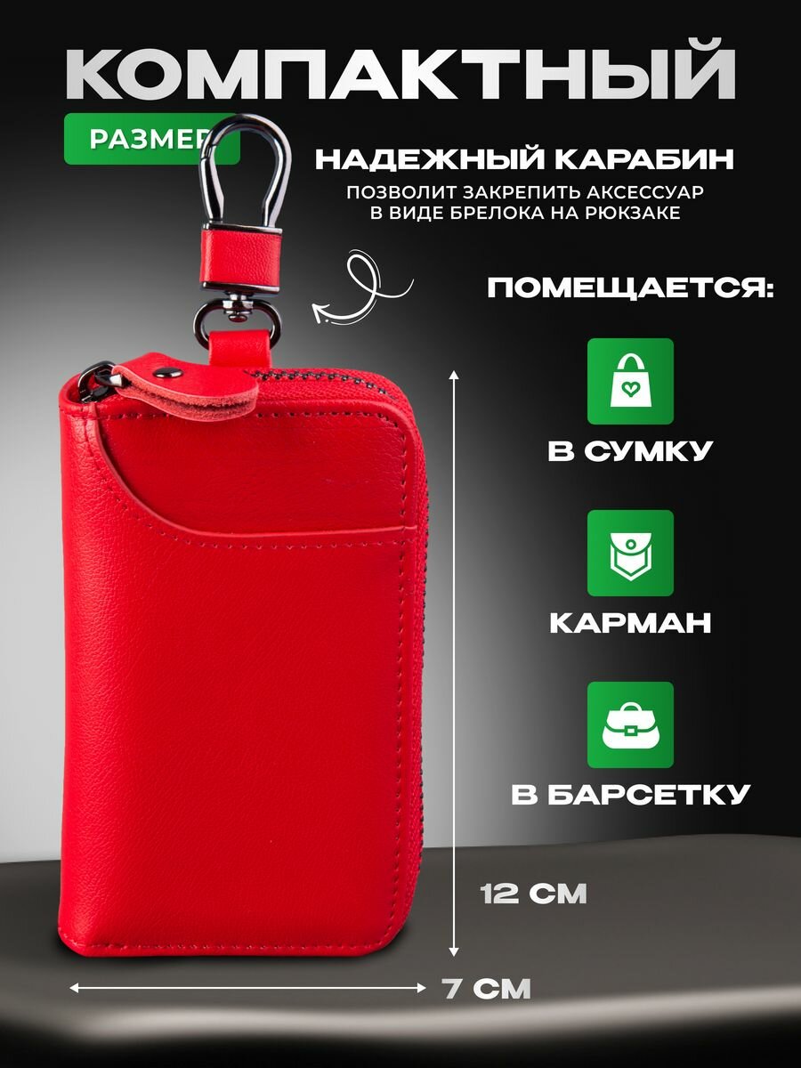 Ключница из натуральной кожи, 2 отделения на молнии, карабин, красный
