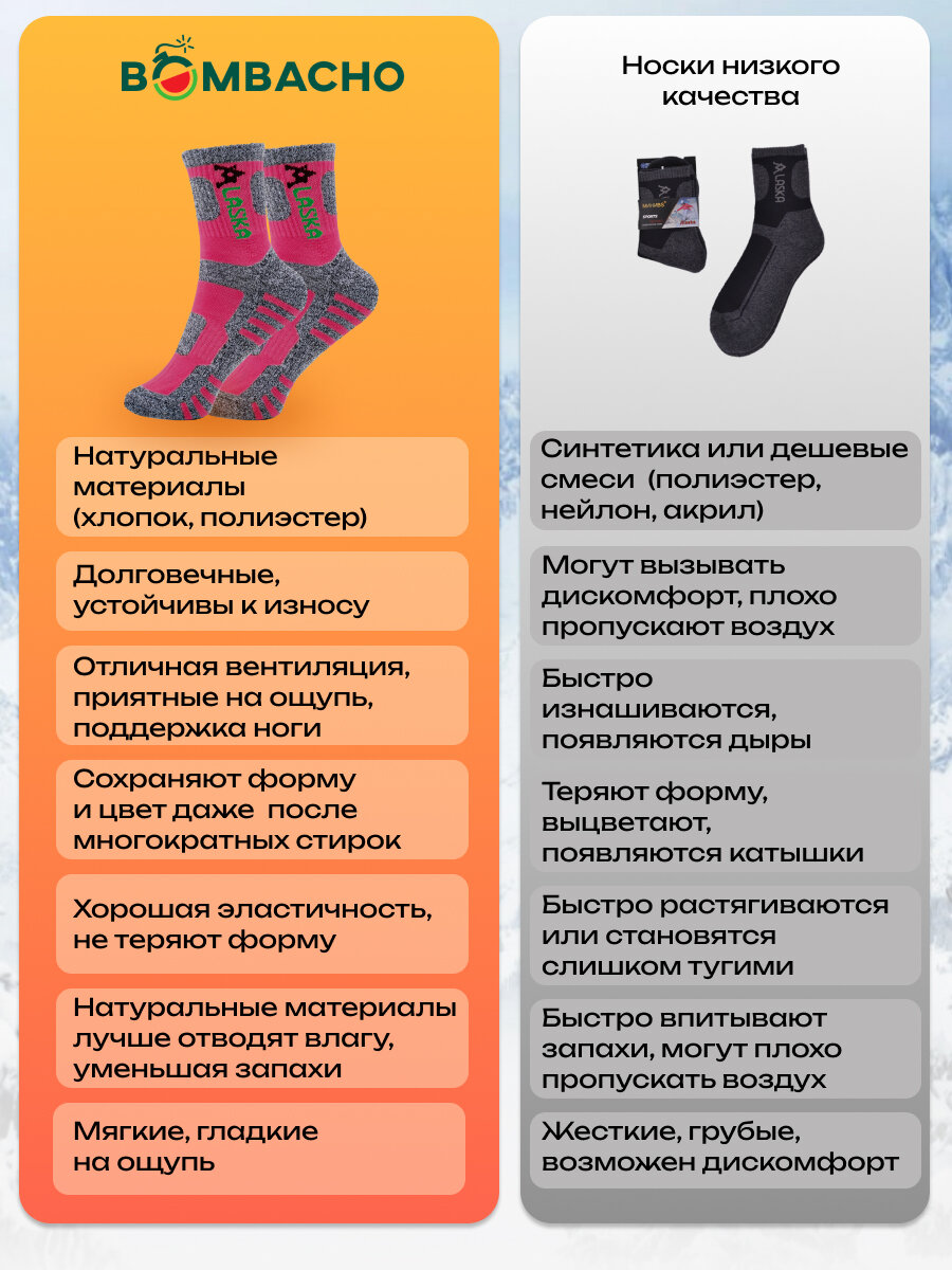 | Особенности | бесшовные, вязаные, износостойкие, усиленная пятка, утепленные |