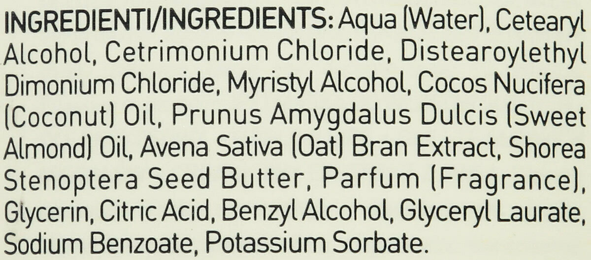 | Состав | aqua (water), cetearyl alcohol, cetrimonium chloride, myristyl alcohol, cocos nucifera (coconut) oil, prunus amygdalus dulcis (sweet almond) oil, avena sativa (oat) bran extract, shorea stenoptera seed butter, parfum (fragrance), citric acid, magnesium nitrate, magnesium chloride, methylchloroisothiazolinone, methylisothiazolinone |
