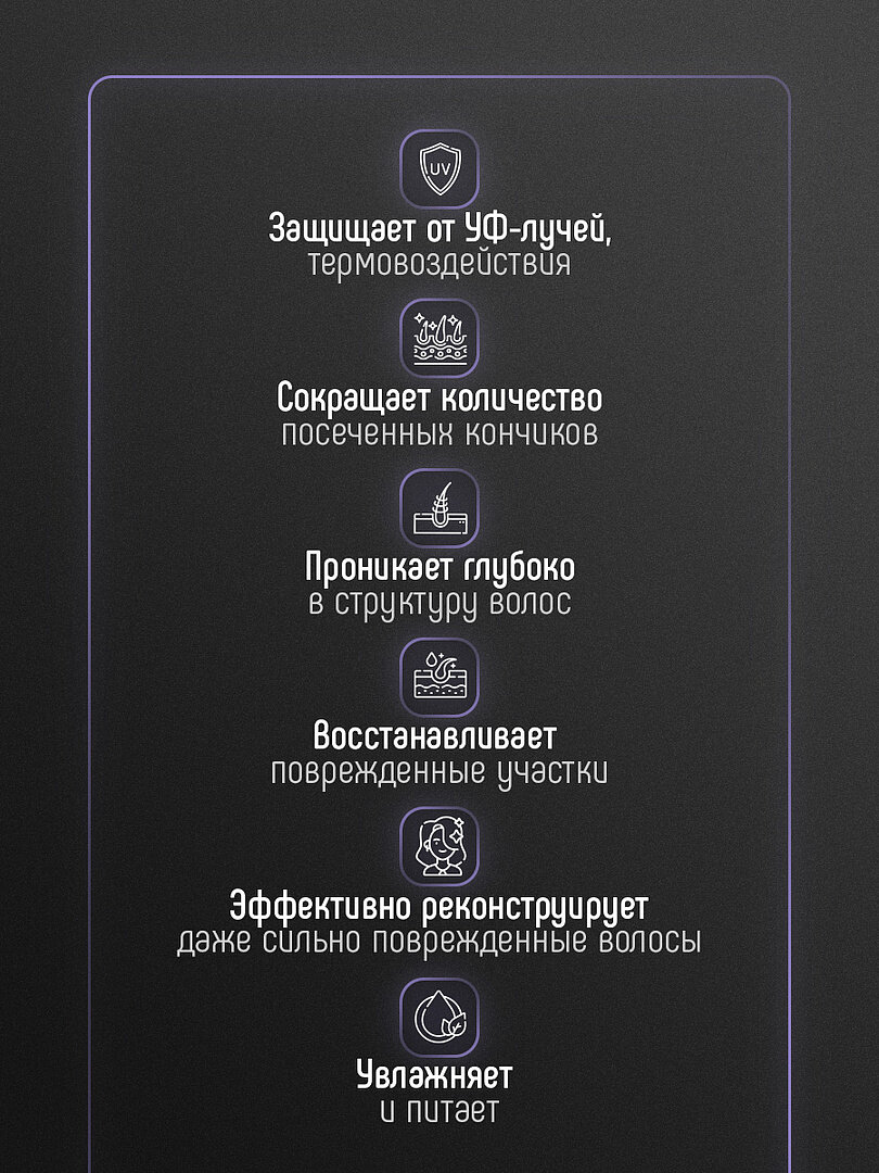 | Эффект | восстановление / облегчение расчесывания / питание / придание блеска / придание мягкости / увлажнение / укрепление |