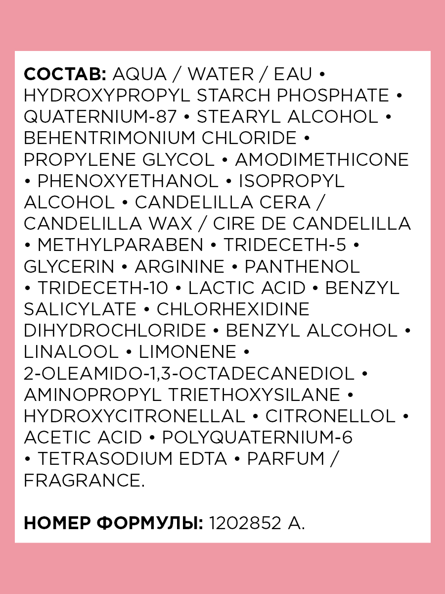 | Состав | aqua / water / eau, hydroxypropyl starch phosphate, quaternium-87, stearyl alcohol, behentrimonium chloride, propylene glycol, amodimethicone, phenoxyethanol, isopropyl alcohol, candelilla cera / candelilla wax / cire de candelilla, methylparaben, trideceth-5, glycerin, arginine, panthenol, trideceth-10, lactic acid, benzyl salicylate, chlorhexidine dihydrochloride, benzyl alcohol, linalool, limonene, 2-oleamido-1,3-octadecanediol, aminopropyl triethoxysilane, hydroxycitronellal, citronellol, acetic acid, polyquaternium-6, parfum/fragrance, c241154/1 |