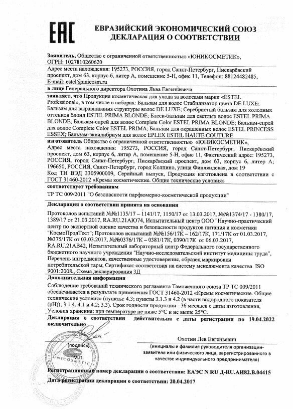 | Эффект | восстановление / защита от негативного воздействия окружающей среды / защита цвета / ламинирование / облегчение расчесывания / питание / придание блеска / придание мягкости / придание объема / придание эластичности / разглаживание / увлажнение / укрепление / уплотнение волос / устранение желтизны |
