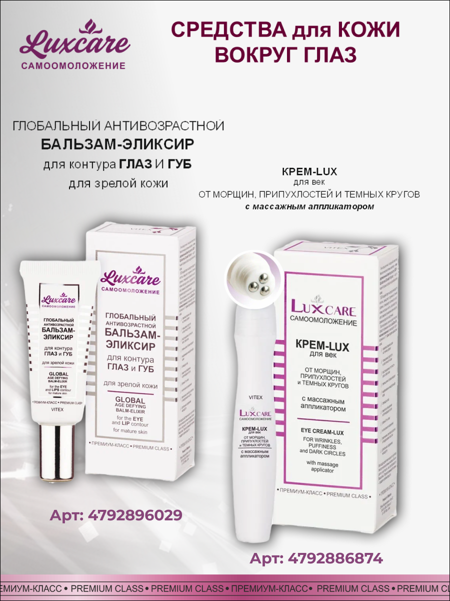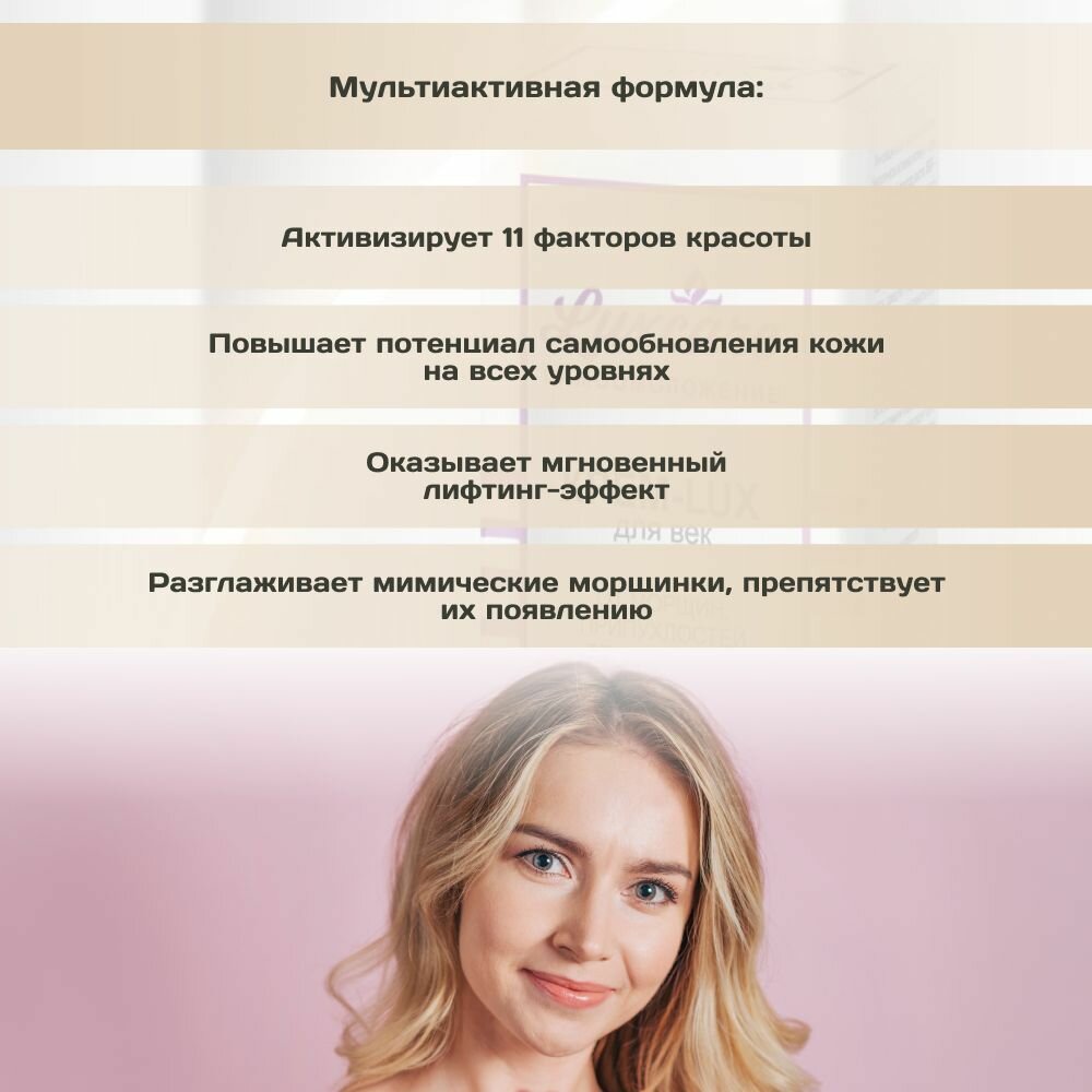 | Способ применения | встряхните флакончик; при помощи массажного аппликатора наносите крем-lux на область вокруг глаз в направлении от наружного уголка глаза к внутреннему утром и вечером; при необходимости вмассируйте крем-lux в кожу кончиками пальцев |
