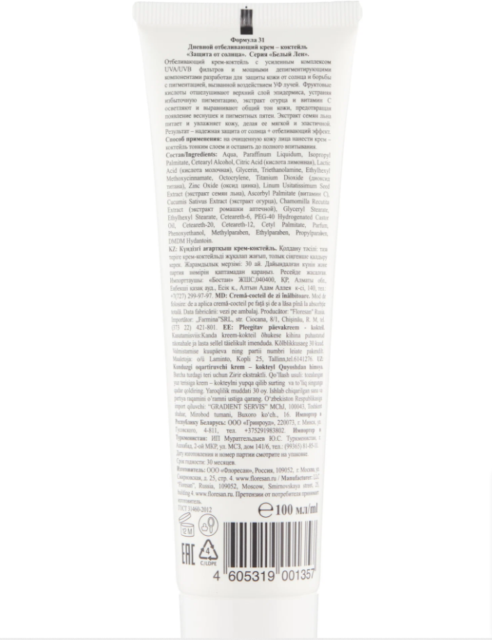 Дневной отбеливающий крем-коктейль "Защита от солнца" "Белый Лен", 100 мл интересное: