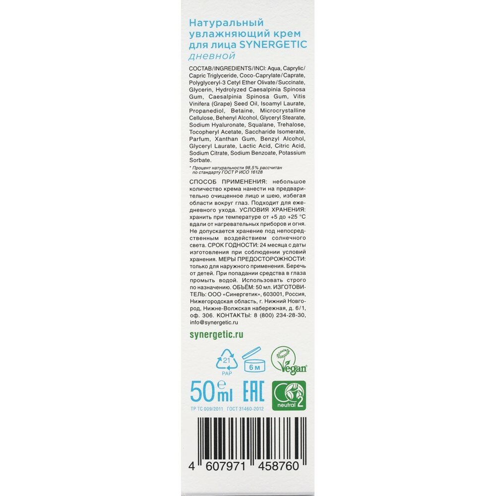 Крем для лица дневной натуральный SYNERGETIC увлажняющий, 50 мл 10367632