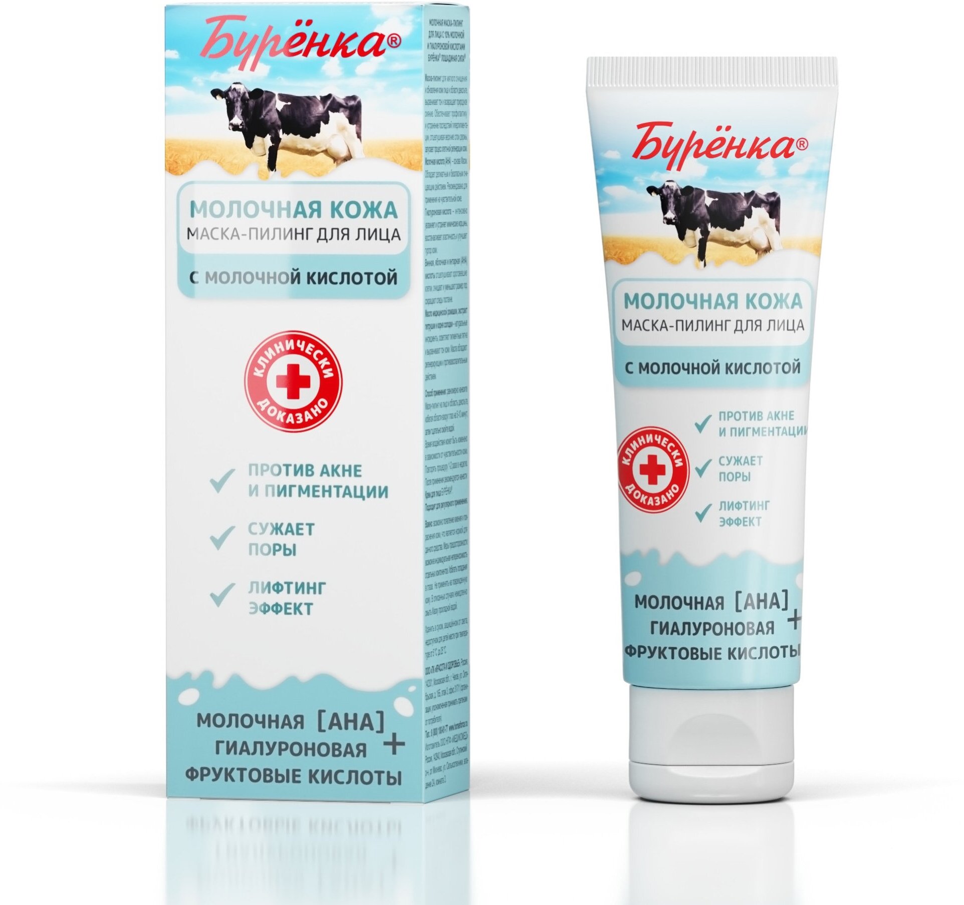 Отбеливающая маска для лица Буренка пилинг против пигментных пятен и веснушек, для сужения пор против черных точек, осветляющие средство с Молочной и Гиалуроновой кислотами, обновление клеток кожи 100 мл
