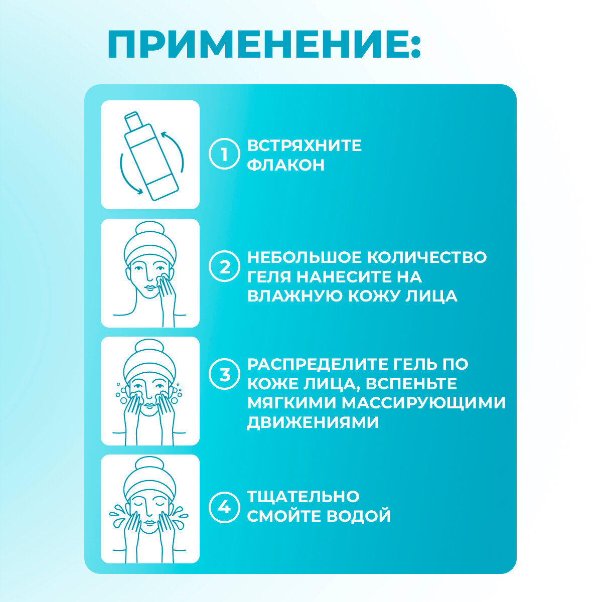 Ополосните лицо теплой водой. Выдавите немного геля на ладонь и вспеньте его. Легкими массажными движениями нанесите на влажную кожу лица и проработайте все участки, избегая зоны глаз и уделив особое внимание Т-зоне (лоб, нос, подбородок). Тщательно смойте теплой водой.