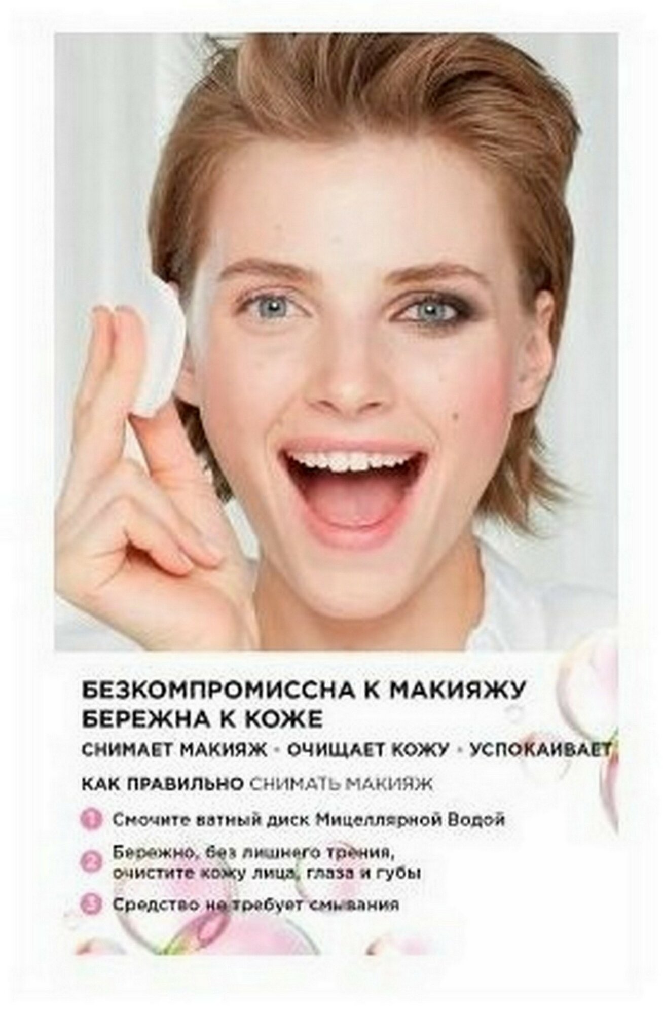 | Способ применения | смочите ватный диск водой и бережно без лишнего трения, очистите кожу лица, глаза и губы |