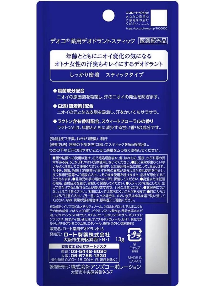ROHTO Японский дезодорант-стик, со сладким цветочным ароматом, против возрастного запаха пота Deoco Deodorant Stick, 13 гр.