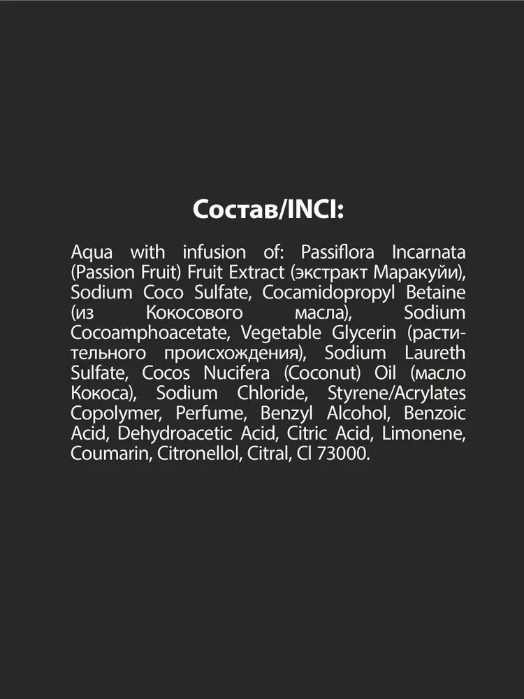 | Состав | Aqua with infusion of: Passiflora Incarnata (Passion Fruit) Fruit Extract (экстракт Маракуйи), Sodium Coco Sulfate, Cocamidopropyl Betaine (из Кокосового масла), Sodium Cocoamphoacetate, Vegetable Glycerin (растительного происхождения), Sodium Laureth Sulfate, Cocos Nucifera (Coconut) Oil (масло Кокоса), Sodium Chloride, Styrene/Acrylates Copolymer, Perfume, Benzyl Alcohol, Benzoic Acid, Dehydroacetic Acid, Citric Acid, Limonene, Coumarin, Citronellol, Citral, Cl 73000 |