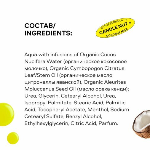 | Состав | Aqua with infusions of Organic Cocos Nucifera Water (органическое кокосовое молочко), Organic Cymbopogon Citratus Leaf/Stem Oil (органическое масло цитронеллы яванской), Organic Aleurites Moluccanus Seed Oil (масло ореха кенди), Glycerin, Cetearyl Alcohol, Urea, Isopropyl Palmitate, Stearic Acid, Palmitic Acid, Tocopheryl Acetate, Sodium Cetearyl Sulfate, Benzyl Alcohol, Citric Acid, Parfum. |