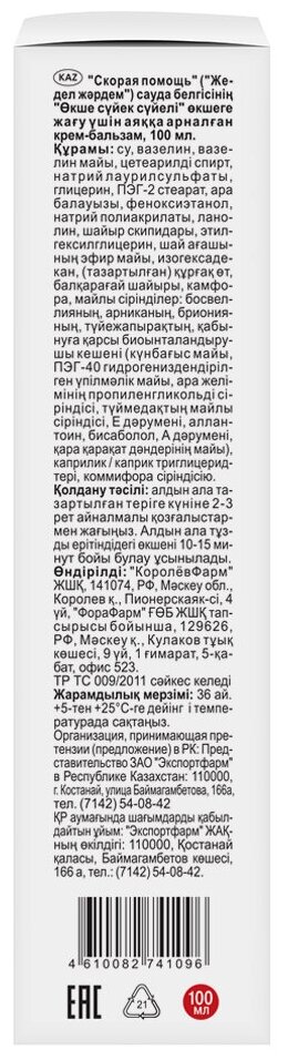 | Способ применения | крем-бальзам наносить предварительно очищенную кожу пяточной области 2-3 раза в день круговыми движениями. Предварительно рекомендуется распарить пятки в солевом растворе в течение 10-15 минут |