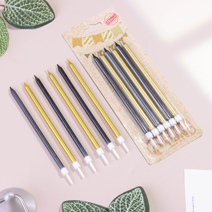 Свечи в торт "Ройс", 6 шт, высокие, 13 см, чёрные и золотые