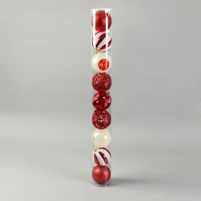 Купить Ёлочные игрушки, шары новогодние , пластик, набор d-8 см, 9 шт "Мелодия" орнамент полосы, бело-красный