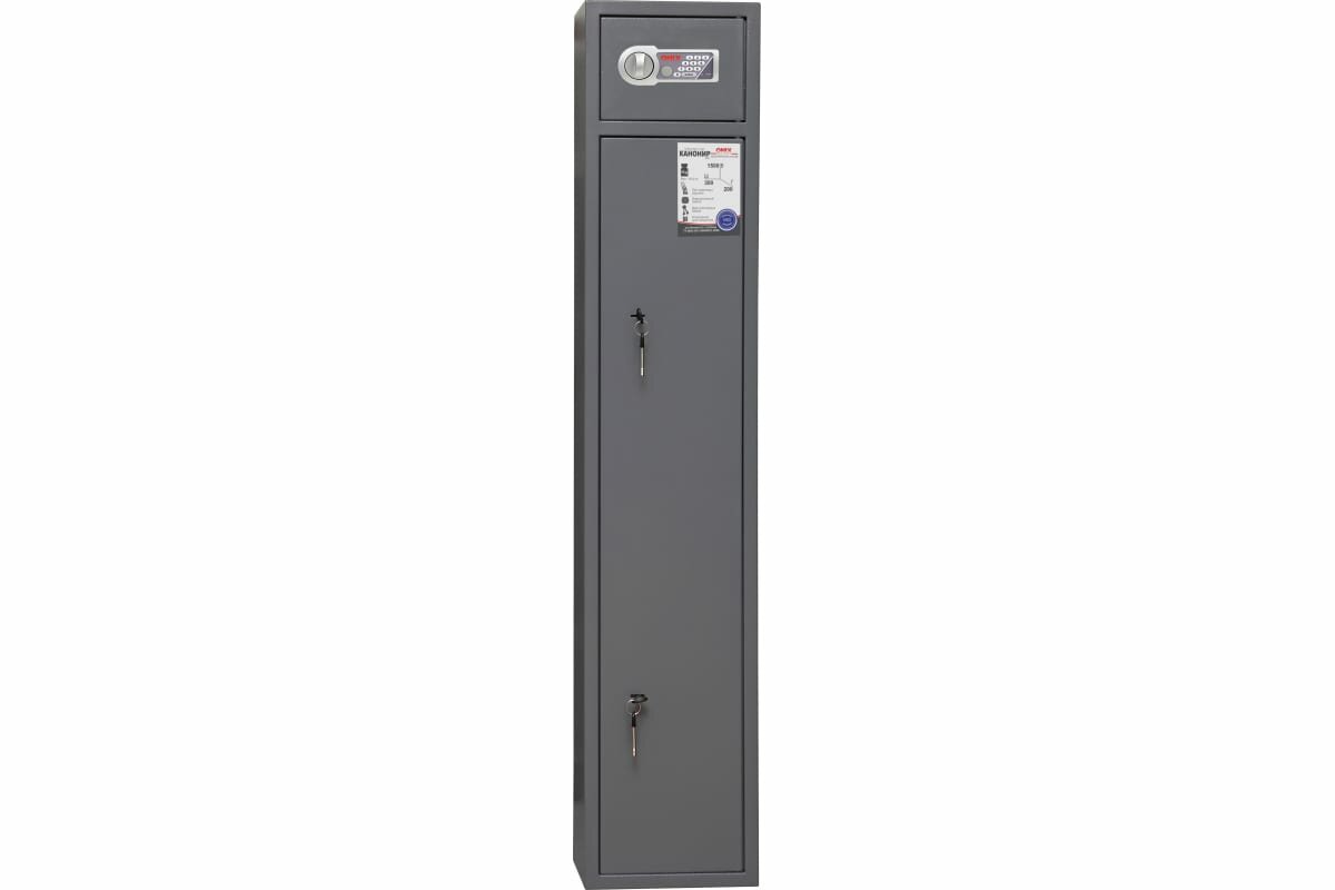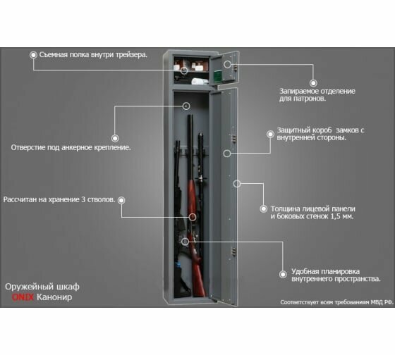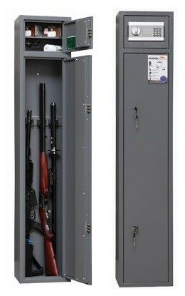 | Плюсы: | Два отсека, отсек под оружие с двумя замками под ключ и отсек под патроны с кодовым замком. На оборотней стороне присутствуют два отверстия, чтобы его можно было повесить на стену. |