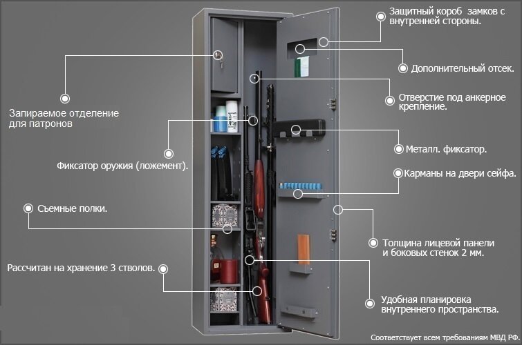 | Минусы: | Маленький отдел под потроны влазит 7 пачек, электронный замок не работает, питание от 4 батареек. |