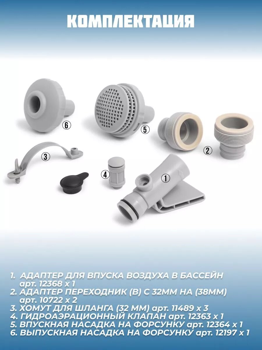 | Дополнительная информация | Комплект позволяет подключить фильтрующие насосы к бассейну, содержит гидроаэрационный клапан. Диаметр подключения составляет 32 мм. |