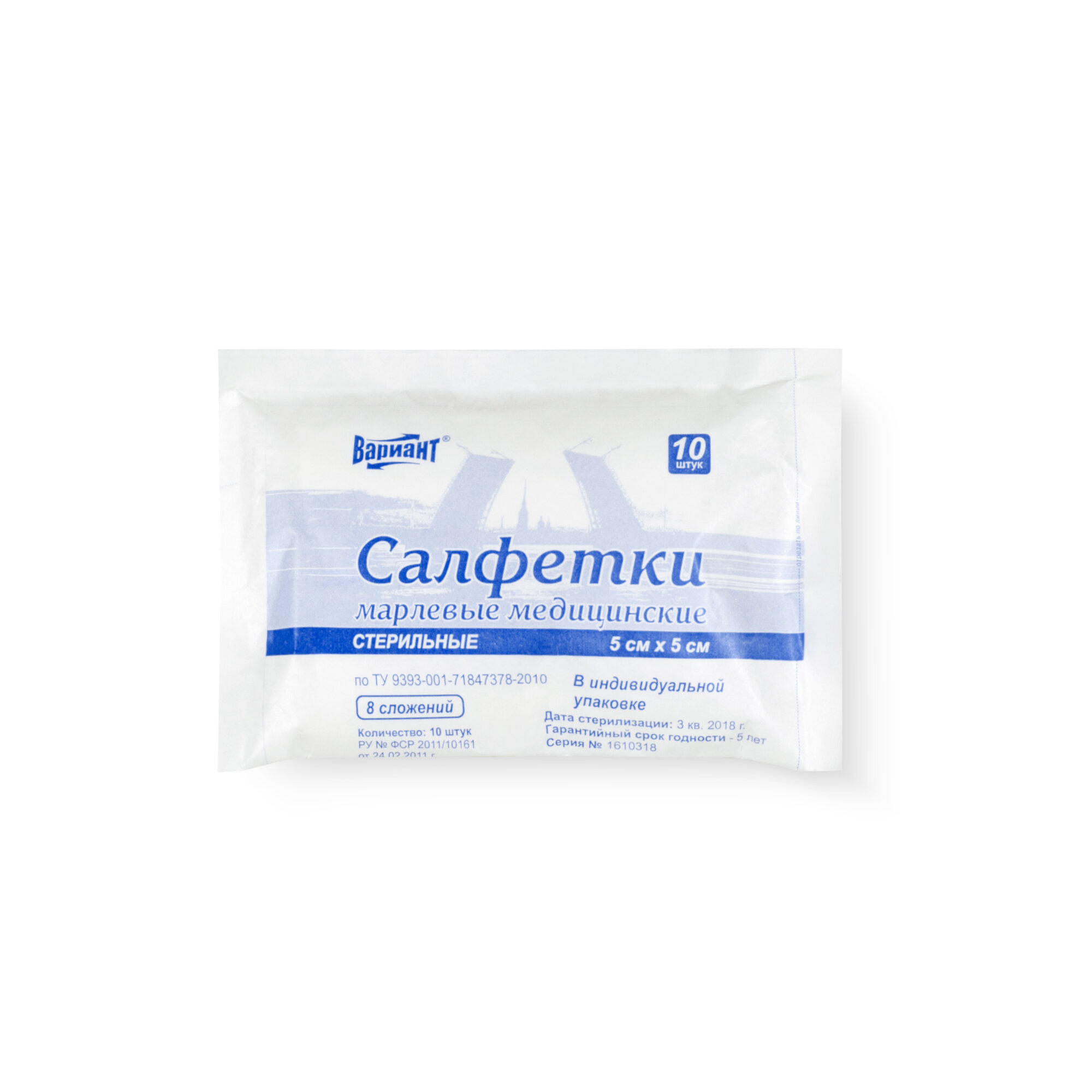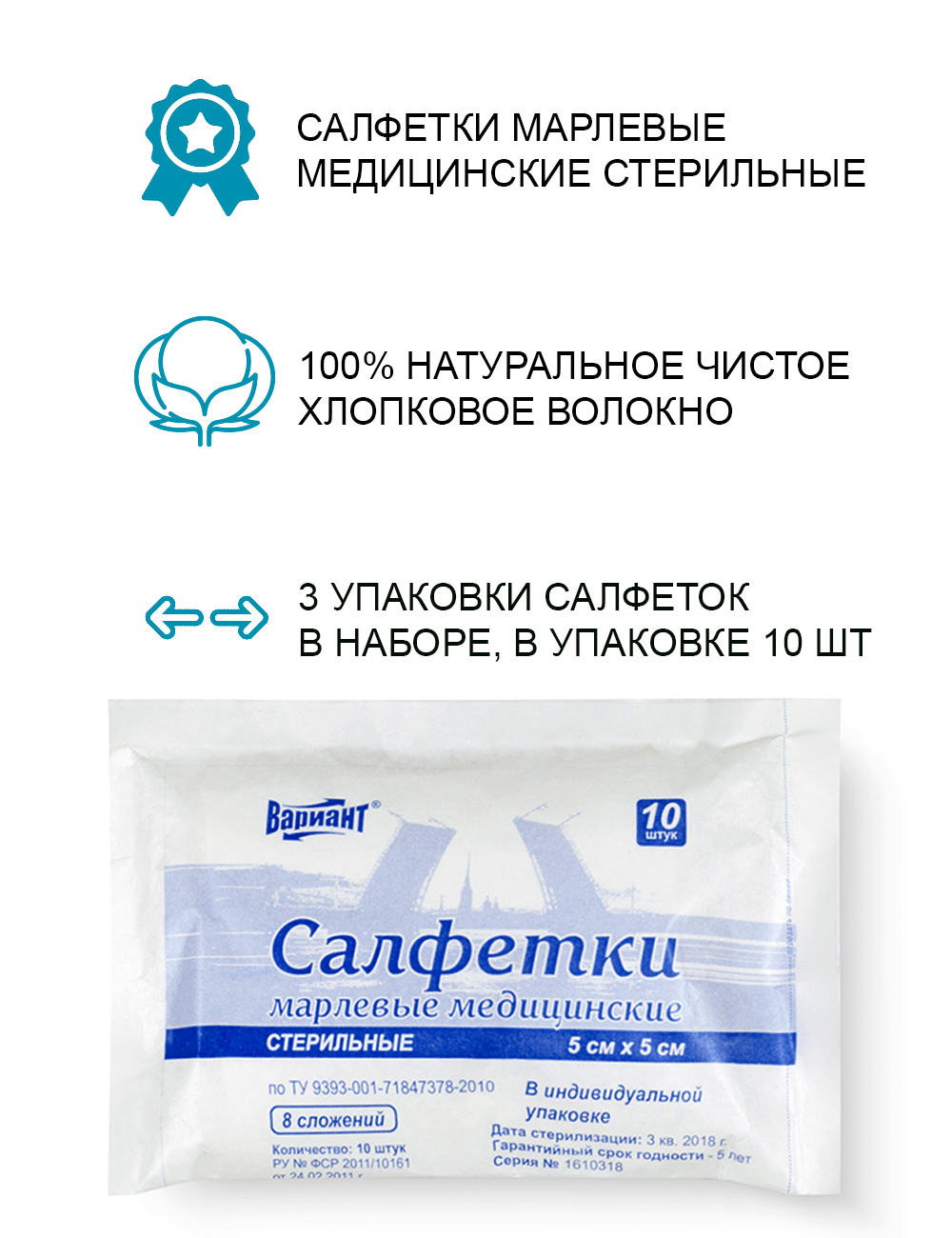 Салфетки марлевые Вариант медицинские стерильные 10см х 10 см №3, 8сл 32г блистер, 5 упаковок в наборе
