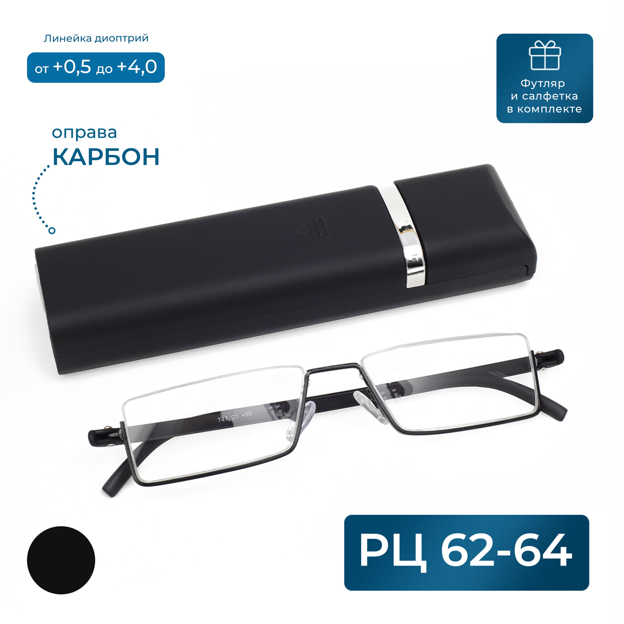 Полуободковые очки лекторы карбоновые (+3.25) противоударные с футляром, TR747 C1, леска сверху, линза пластик, цвет черный, pd 62-64