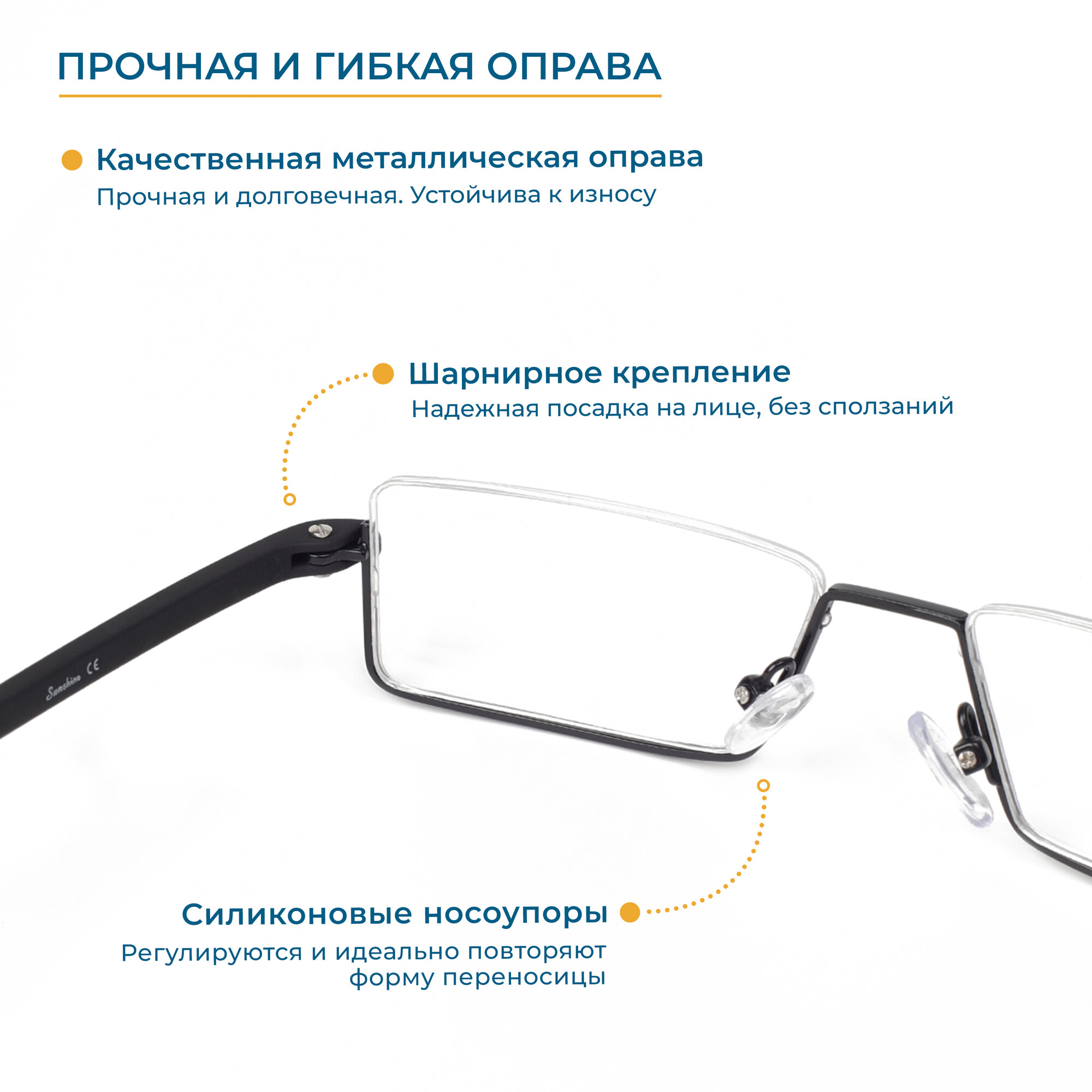 Полуободковые узкие очки с диоптриями (+4.00) противоударные с футляром, TR747 C1, леска сверху, линза пластик, цвет черный, pd 62-64