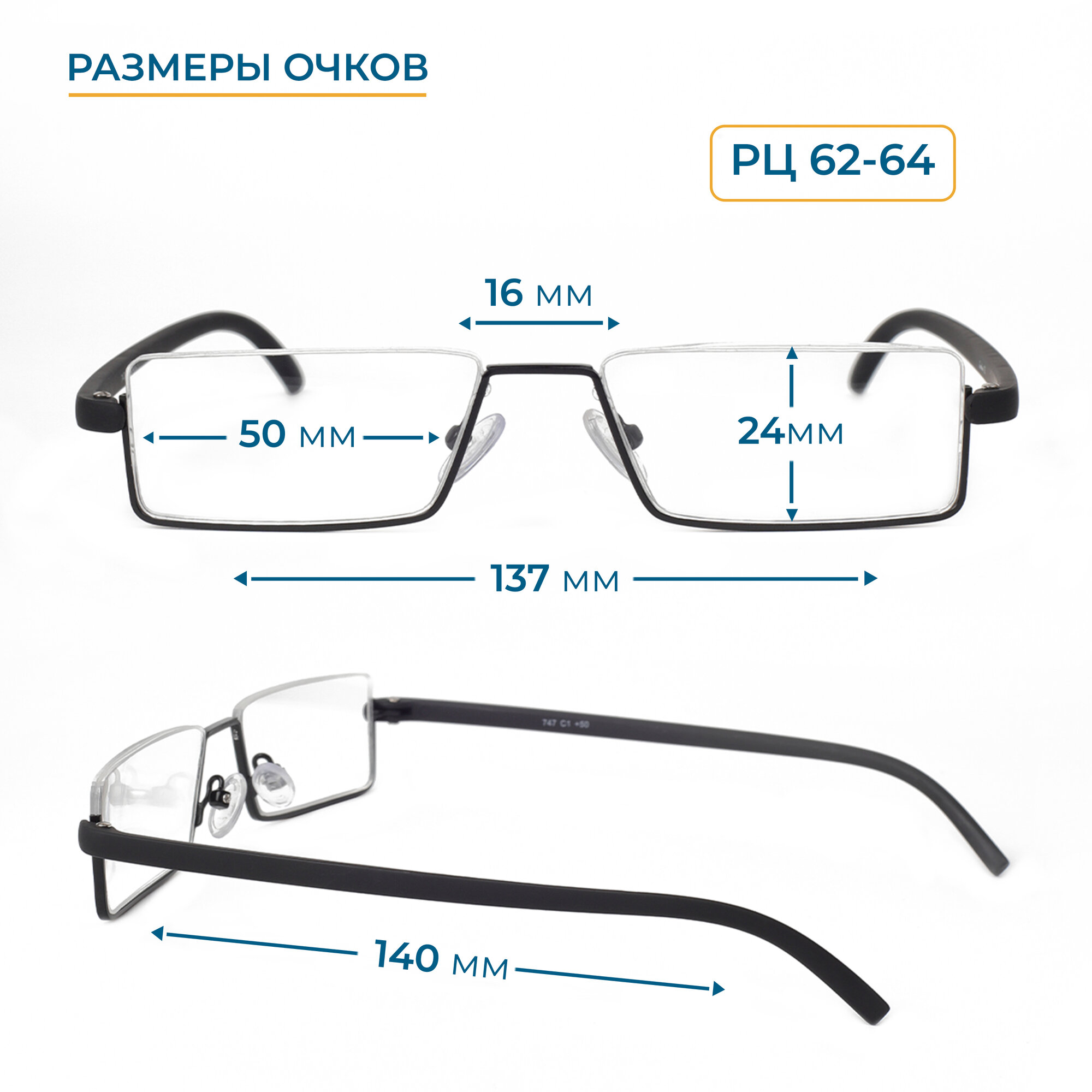 Очки очки лектор для чтения полуободковые (+1.50) противоударные с футляром, TR747 C1, леска сверху, линза пластик, цвет черный, pd 62-64