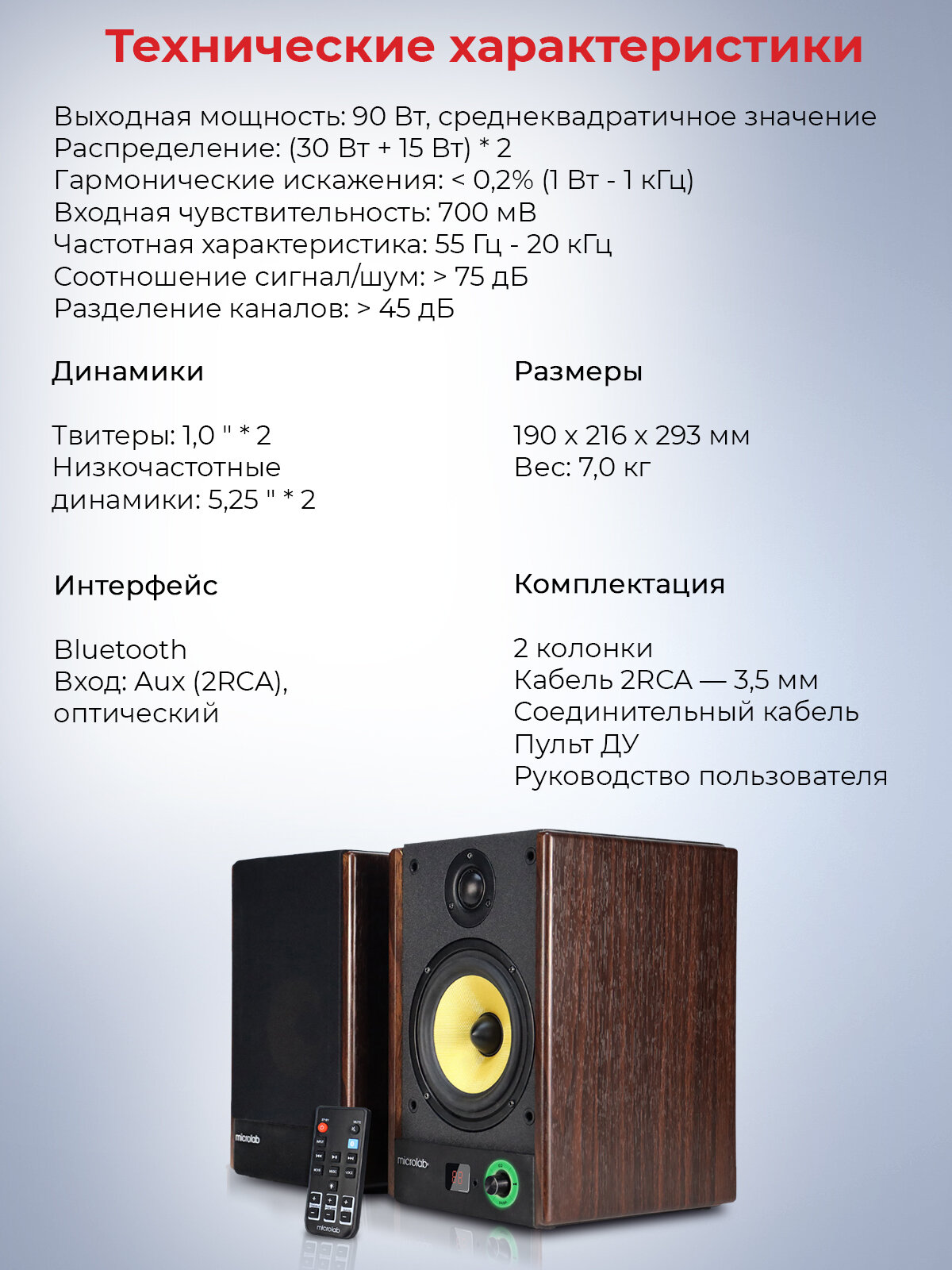 | Комплектация | 2 колонки Кабель 2RCA- 3,5 мм Соединительный кабель Руководство пользователя |