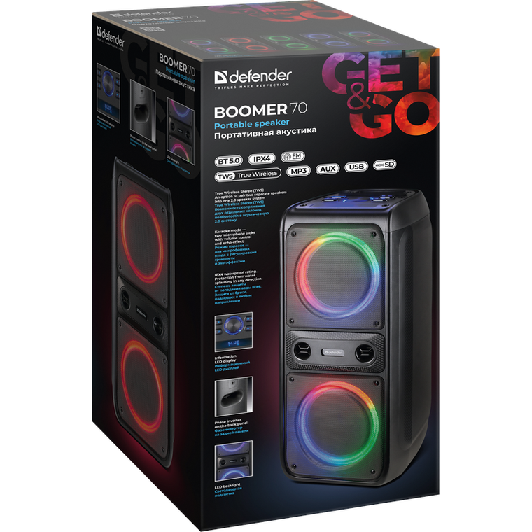 Колонки DEFENDER Boomer 70 60Вт, Light/BT/FM/USB/LED/IPX4