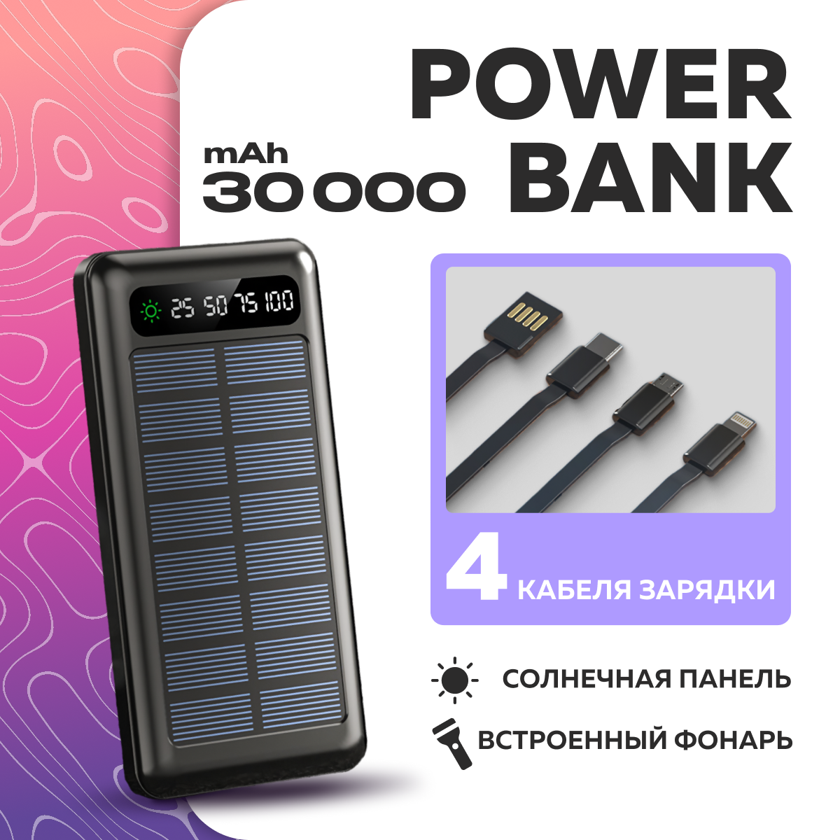 Купить Мощный портативный повербанк 30000mAh, Внешний аккумулятор, встроенные кабеля, солнечная батарея, фонарик