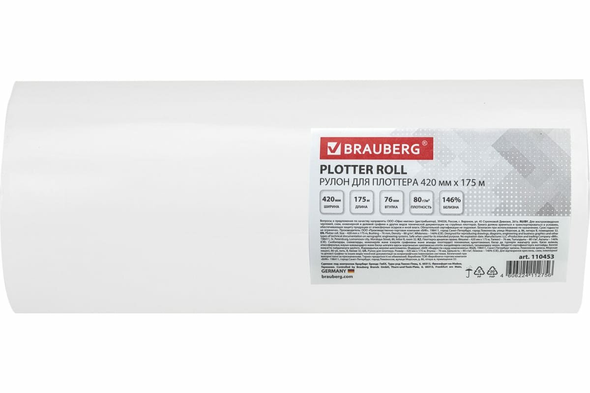 Рулон для плоттера, 420 мм х 175 м х втулка 76 мм, 80 г/м2, белизна CIE 162%, диаметр 170 мм, BRAUBERG, 110453
