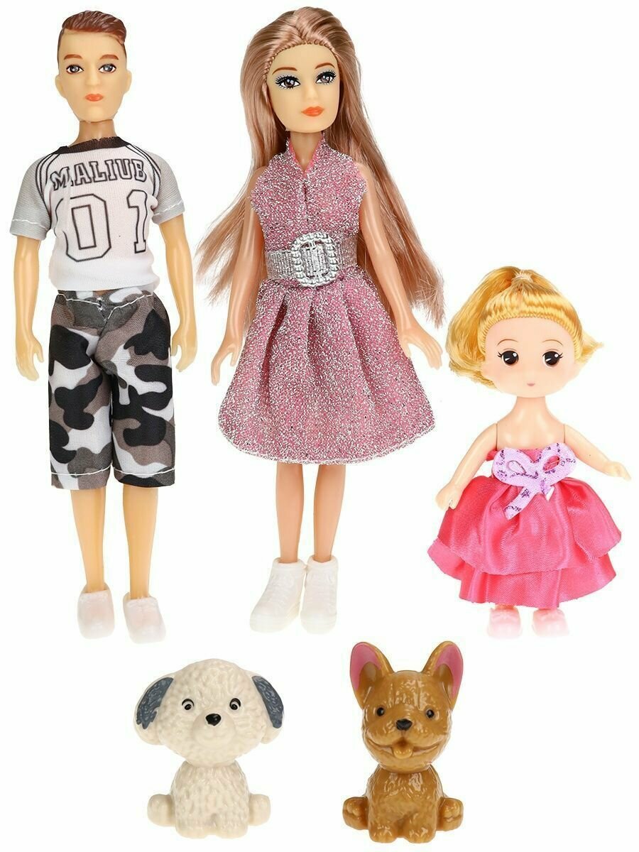 | Подробная комплектация | 3 куклы: 2 большие -15 см, 1 маленькая -10 см, 2 питомца: 3,5х2,3 см, 3х3,5 см, мебель |